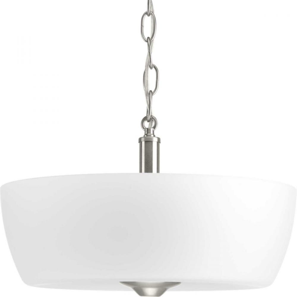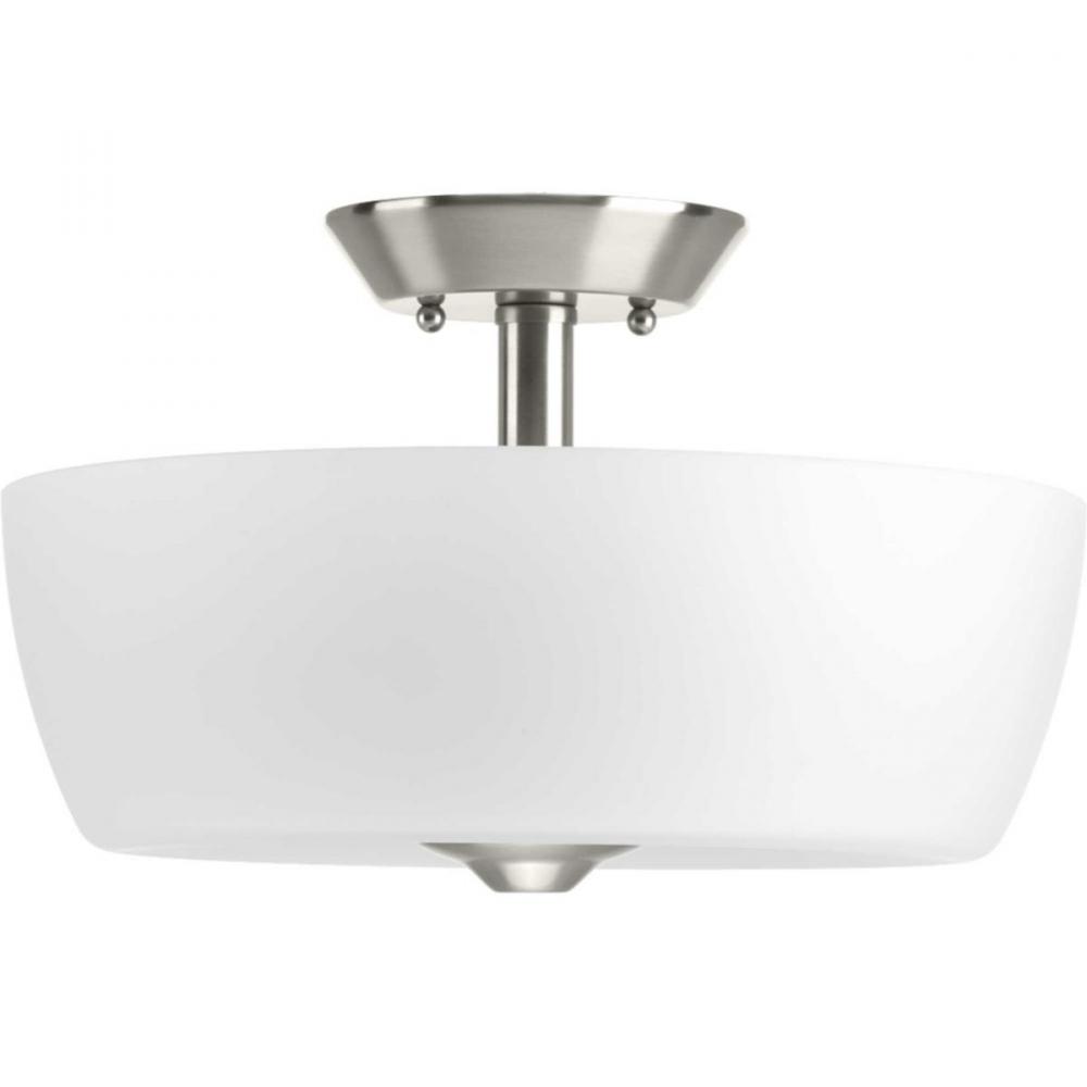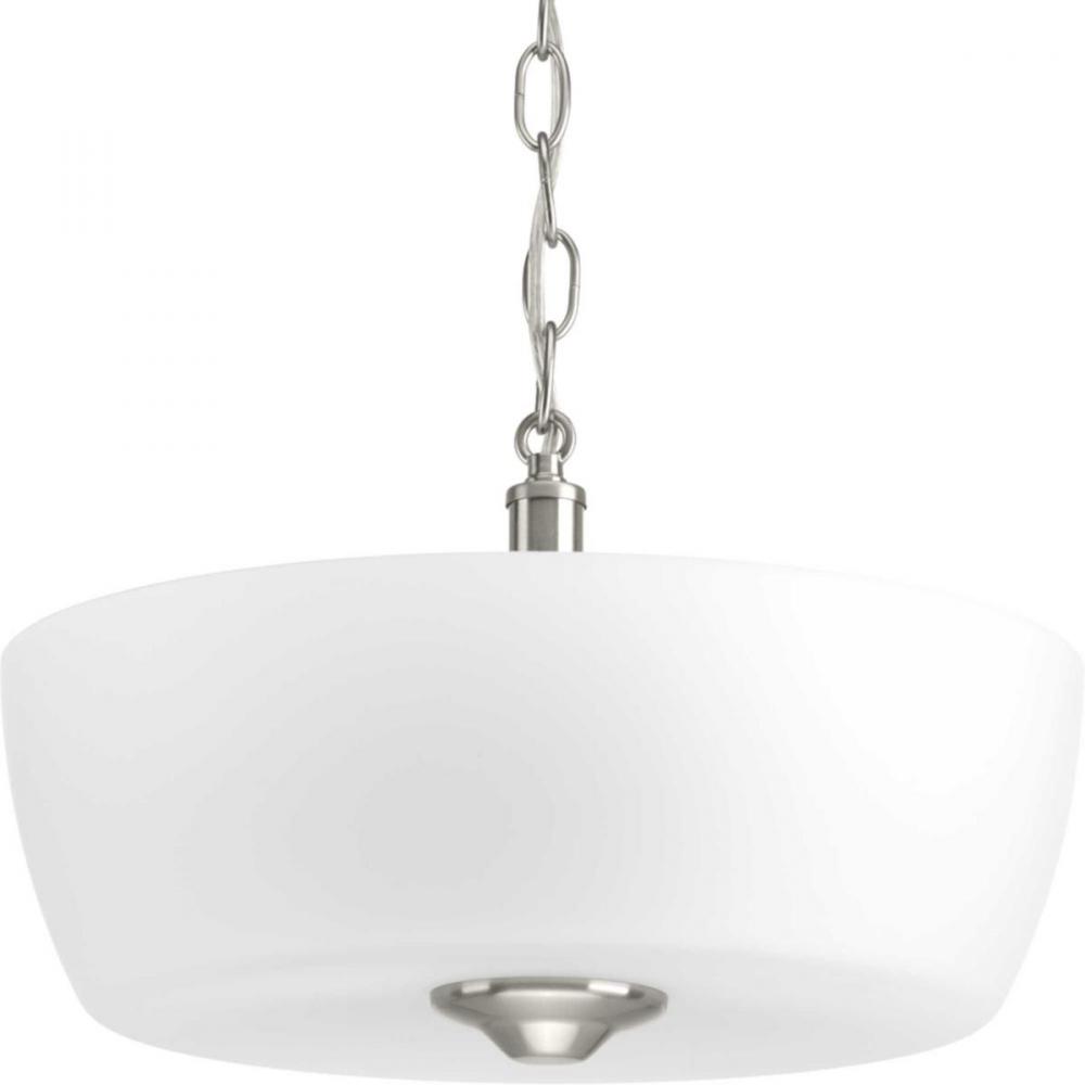 The Leap collection features etched glass shades that are slightly larger in scale to complement contemporary design trends. This two-light semi-flush convertible is finished in Brushed Nickel.