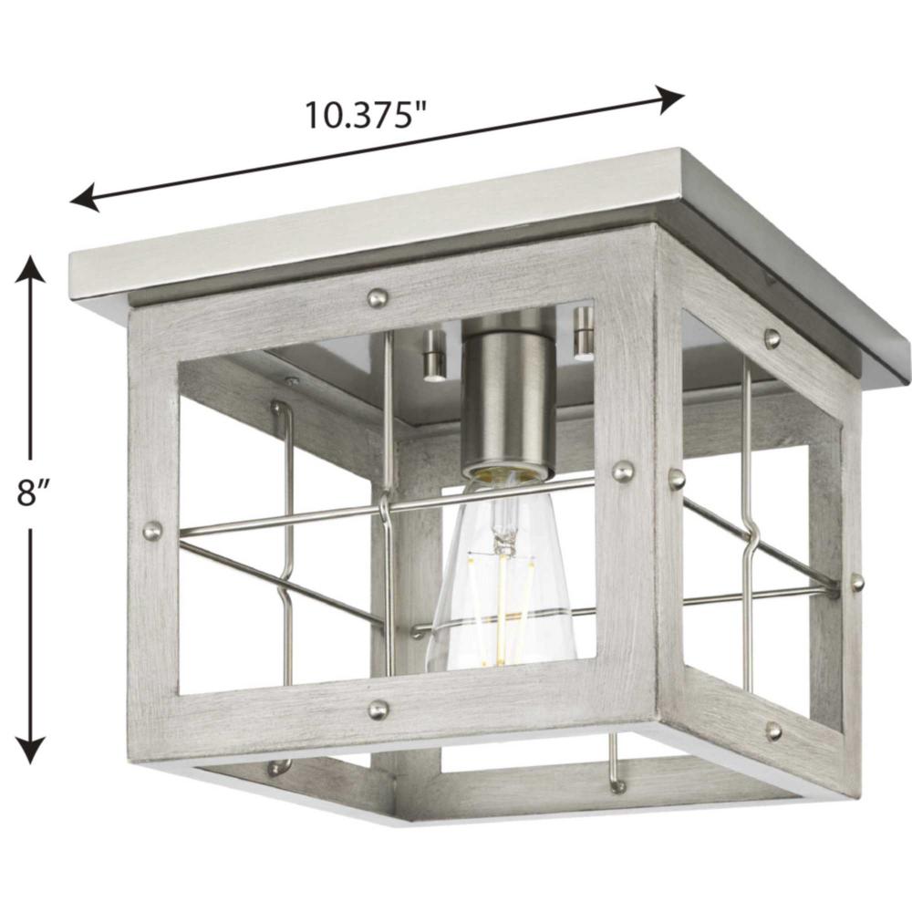 Experience the perfect blend of farmhouse character and urban sophistication with the Hedgegrow Collection 1-Light Grey Washed Oak Farmhouse Flush Mount Ceiling Light. The softly textured, artistic faux wood frame showcasing a classic windowpane design is coated in a grey washed oak finish with beautiful brushed nickel accents that elevates the typically farmhouse aesthetic. The light source peeks through the windowpane design for an overall lighter look and feel.