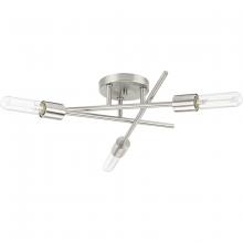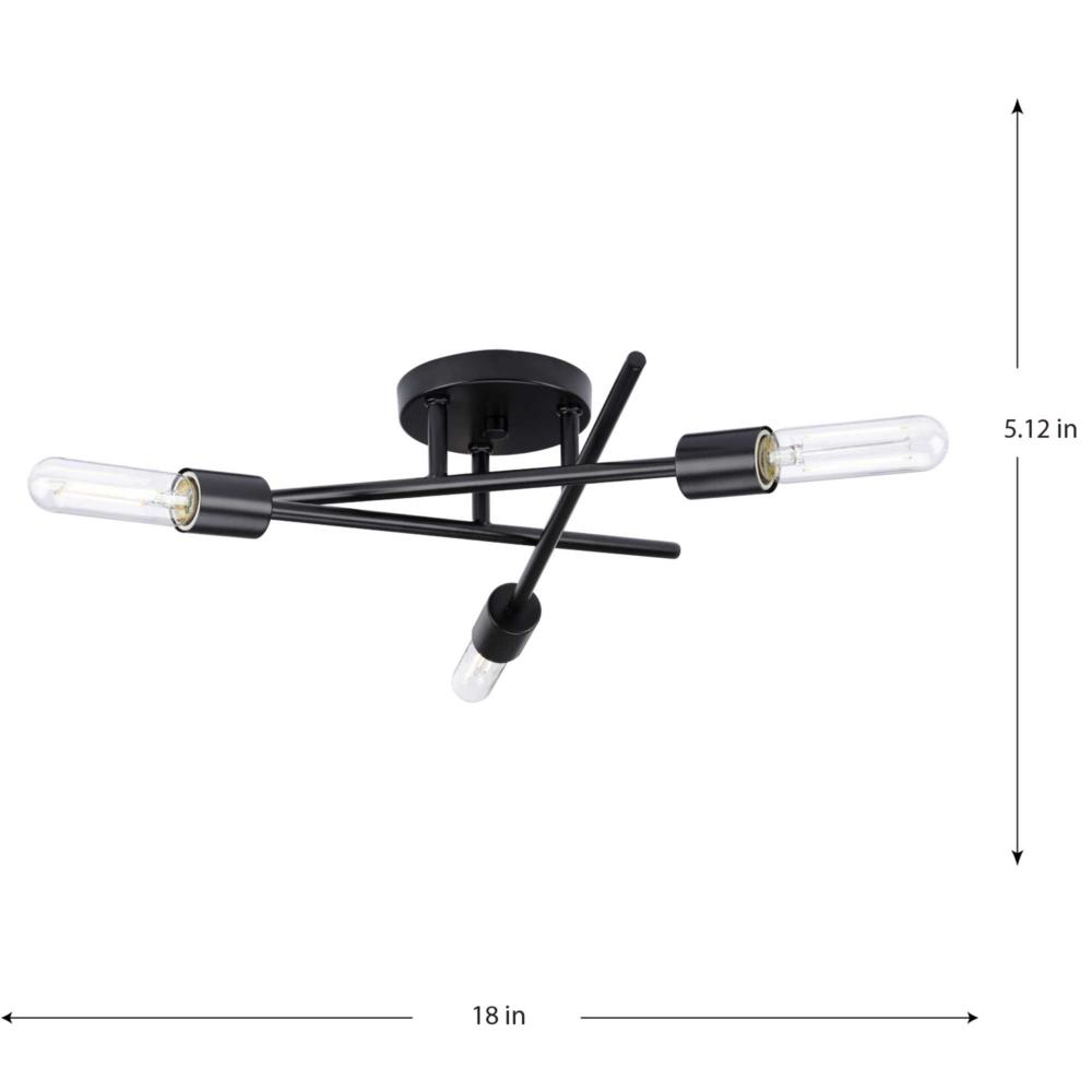 The Astra semi-flush mount light features a space-age-inspired design perfect for modern and mid-century décor. A trio of spoked arms radiate out from a cylindrical down rod suspended from a center round canopy, bringing a dynamic flair to the fixture's design. A matte black finish adds a touch of sophistication. Decorative bulbs (sold separately) adorn the ends of each perpendicular arm. The generous scale is ideal for bringing illumination to bedrooms, hallways and family rooms. This fixture is part of the Progress Lighting Design Series, a lighting collection offering fashionable styles and affordable luxury lighting for the home.