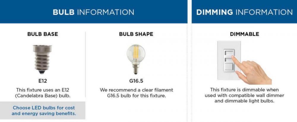 Uses (3) 60-Watt maximum candelabra (G 16.5) base bulbs, or LED equivalent, that are sold separately, dimmable when used in conjunction with a dimmable bulb