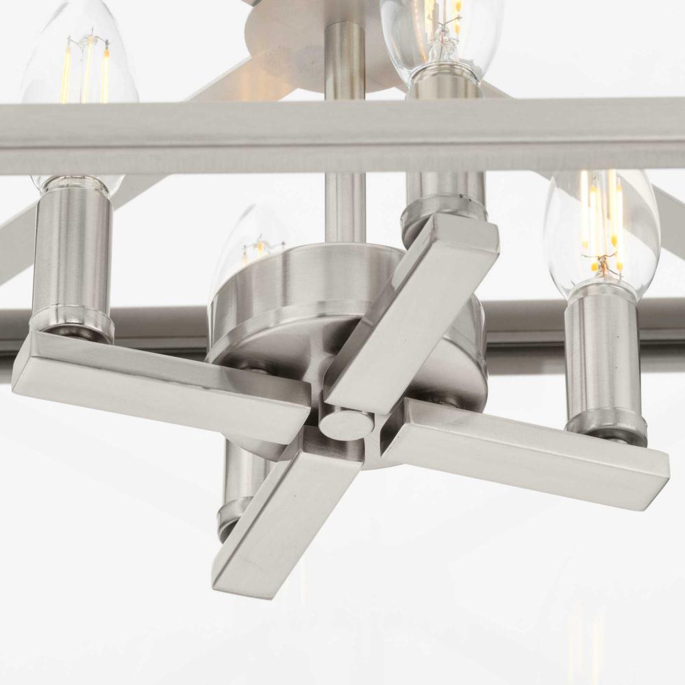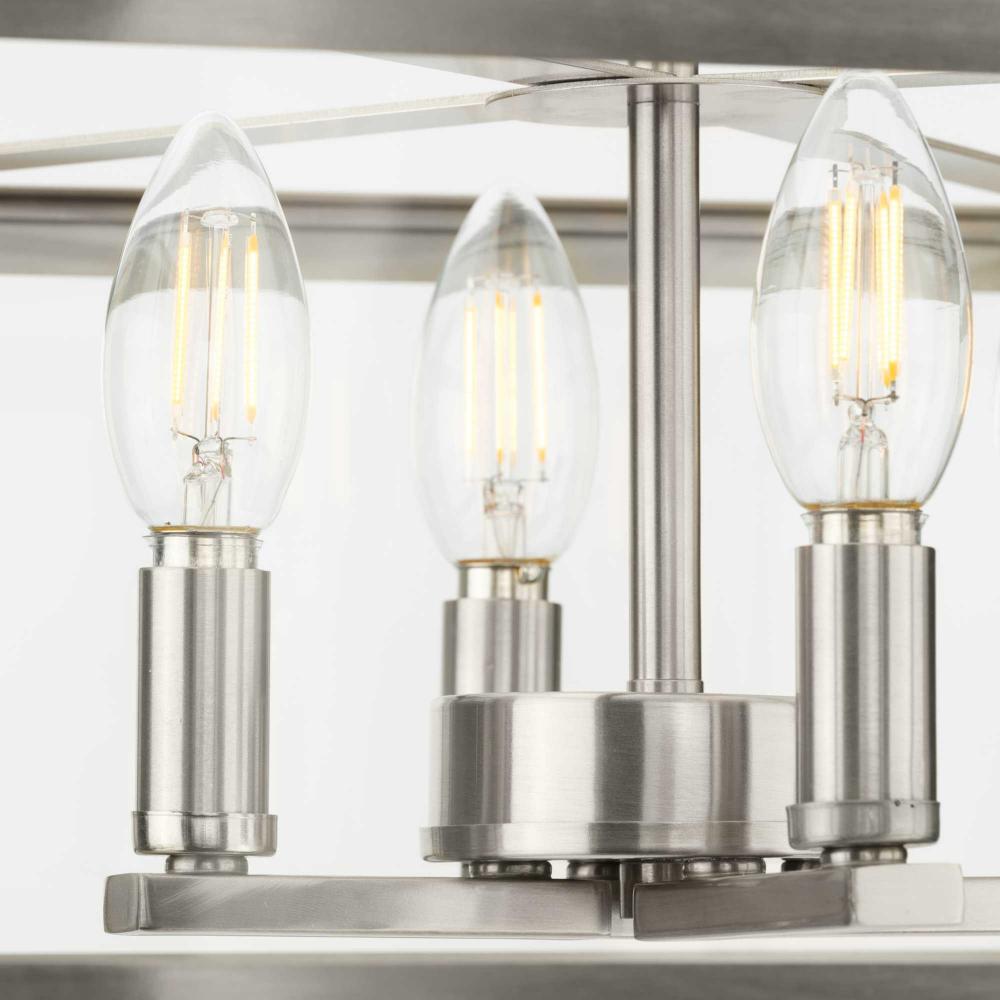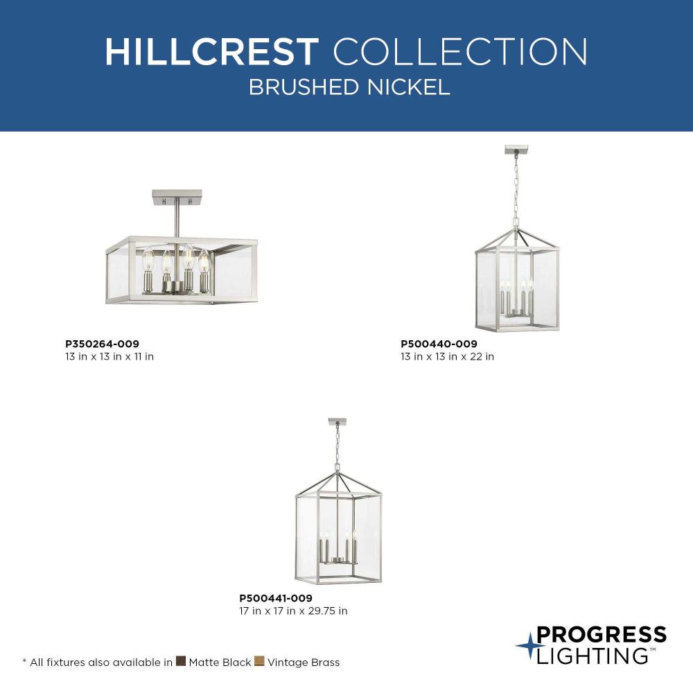 The Hillcrest Semi-Flush Light interprets the traditional carriage light for the modern age, giving it a fresh update with a refined angular silhouette. A classic candelabra base is suspended within a clear beveled glass frame.Clear illumination is cast from its airy design.