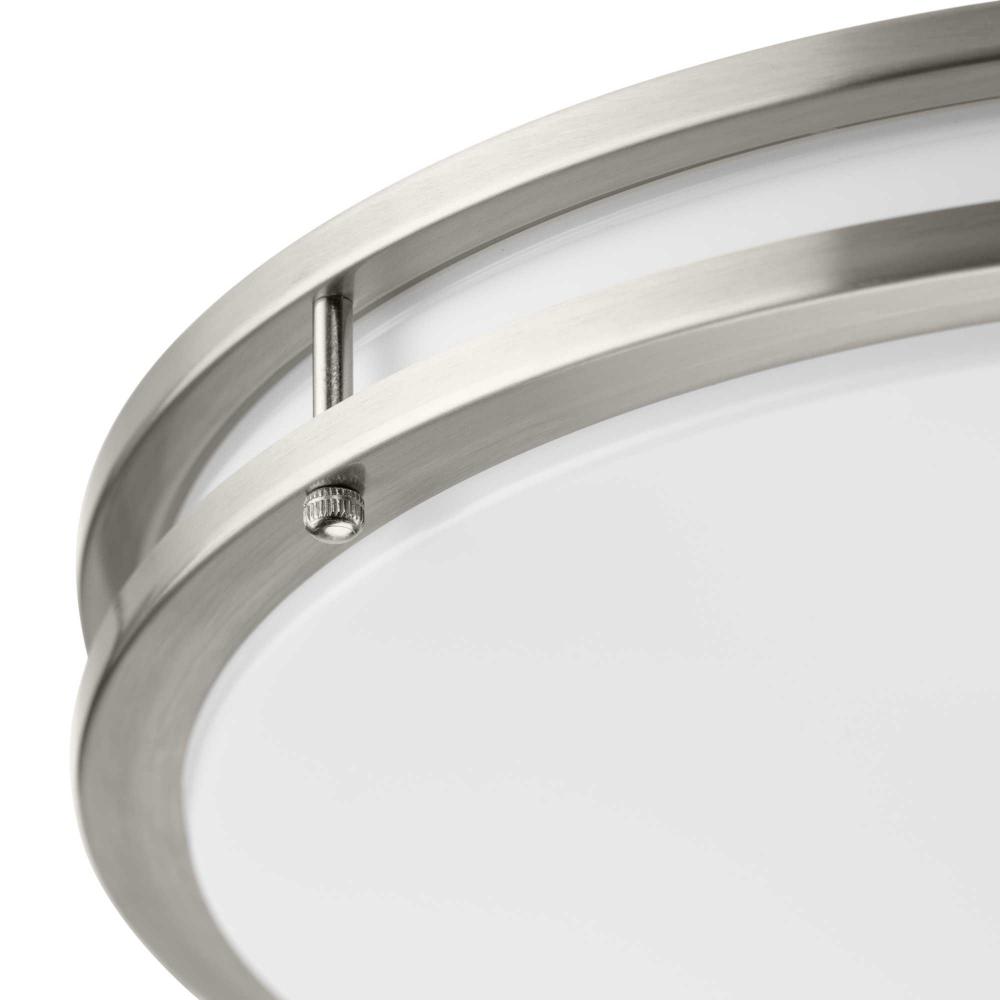 The Abide Integrated LED Large Round Flush Mount Light is precision crafted for contemporary settings. Sleek Brushed Nickel circular bands hold a white acrylic diffuser concealing its 5 CCT selectable (2700K, 3000K, 3500K, 4000K and 5000K) dimmable LED light source.