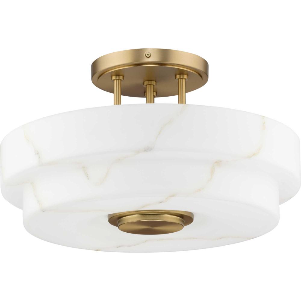 The Tosca Collection semi-flush mount ceiling light features a Brushed Bronze finish with tiered round glass shade crafted with a faux alabaster finish that radiates patterns of light and shadow, adding depth and warmth that enchant any room. This fixture is part of the Progress Lighting Design Series, a lighting collection offering fashionable styles and luxury lighting for the home.