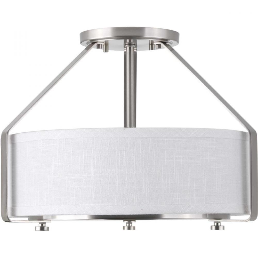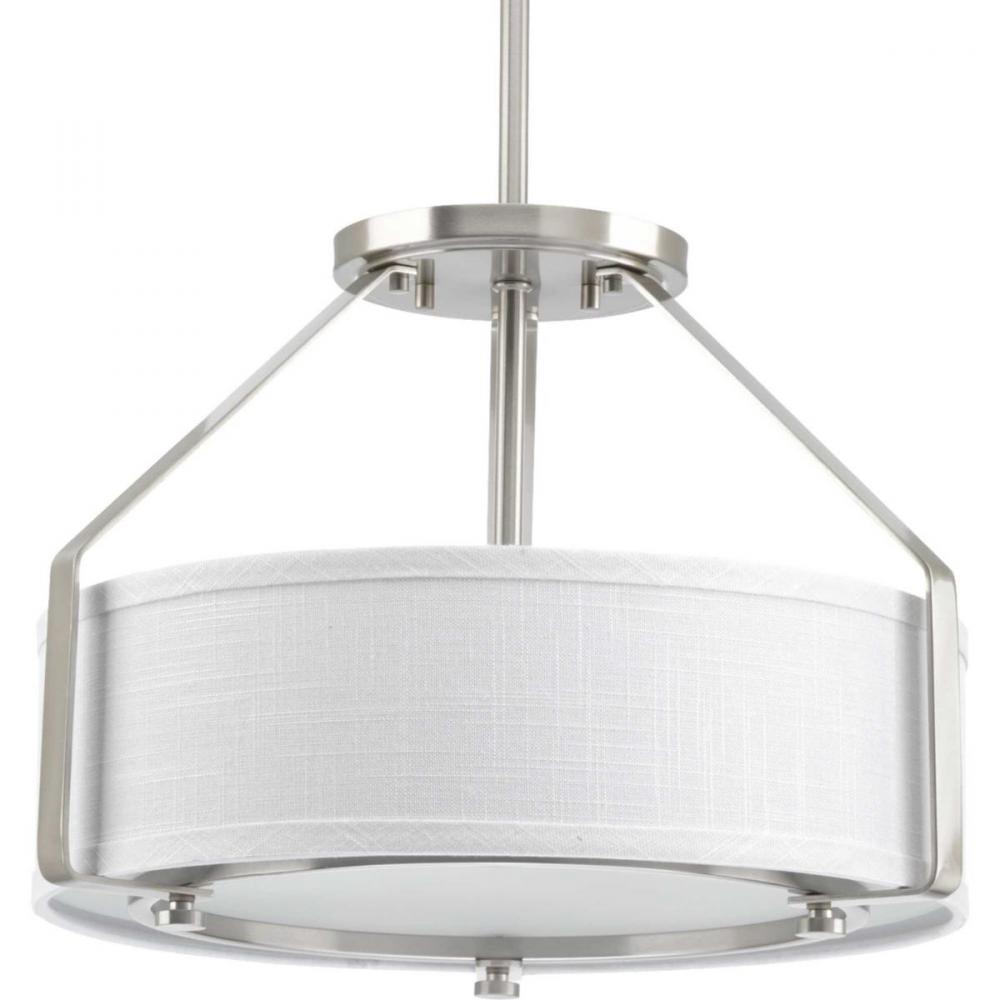 The three-light semi-flush offers a sleek metal frame that supports a low-slung shade to create Ratio’s casual modern style. The frame’s proportion to the white linen drum shade evokes a perfect ratio for lighting. Includes a polished glass exterior, etched glass interior diffuser that offers an elegant appeal and is easier to clean – offering both fashion and function. This fixture can be mounted as a semi-flush or used as a hanging pendant for a wide variety of applications. Brushed Nickel finish.