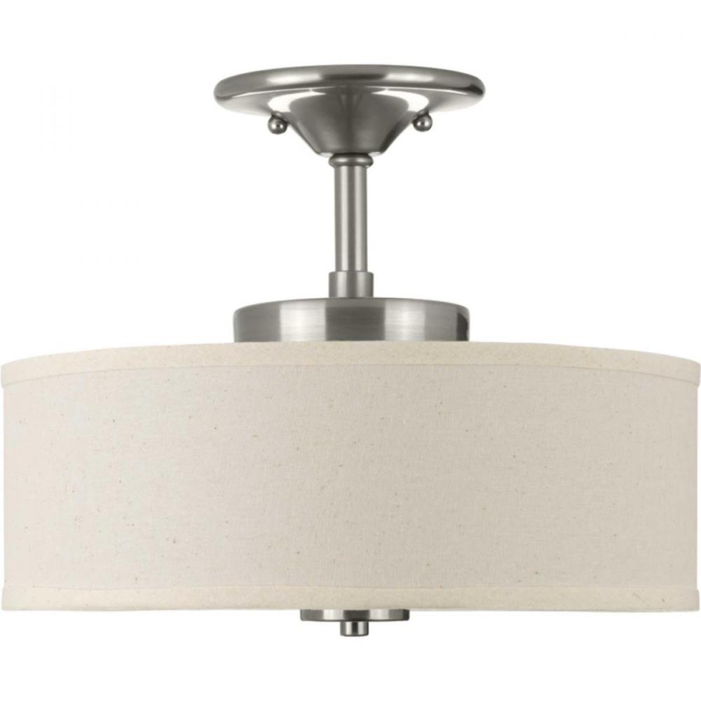 Harkening back to a simpler time, the Inspire Collection freshens traditional forms with flowing lines. The one-light Brushed Nickel LED semi-flush mount Inspire features an etched glass diffuser with an off-white linen shade.