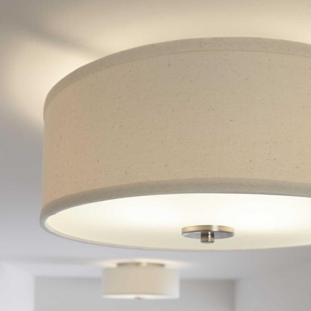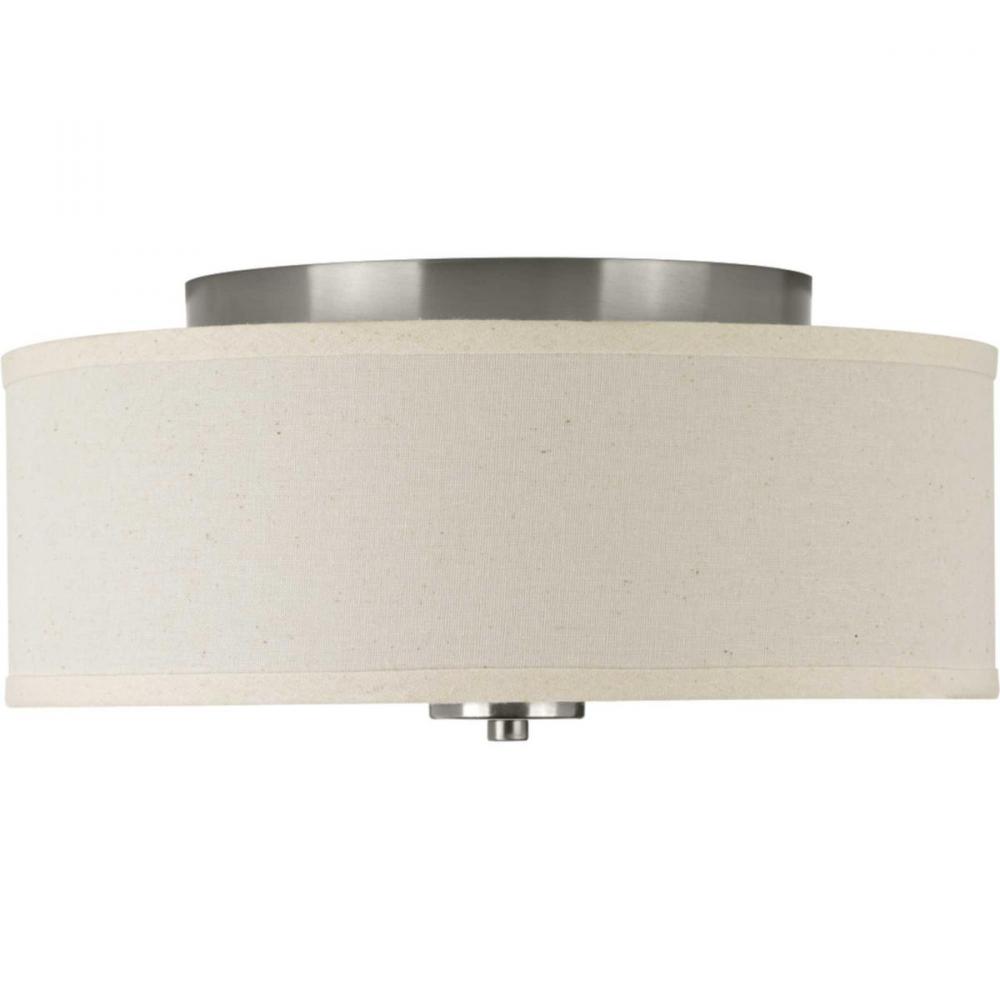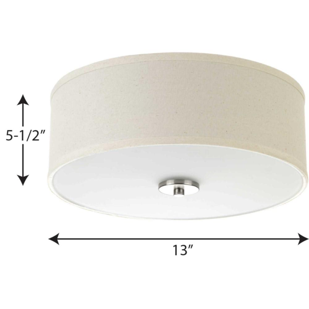 Harkening back to a simpler time, the Inspire Collection flush mount ceiling light freshens traditional forms with clean lines. The two-light brushed nickel semi- mount ceiling light features an etched glass diffuser with an off-white linen shade. This fixture is suitable for a variety of design styles, including transitional, traditional and farmhouse and the simple design is a perfect for a variety of locations throughout the home.