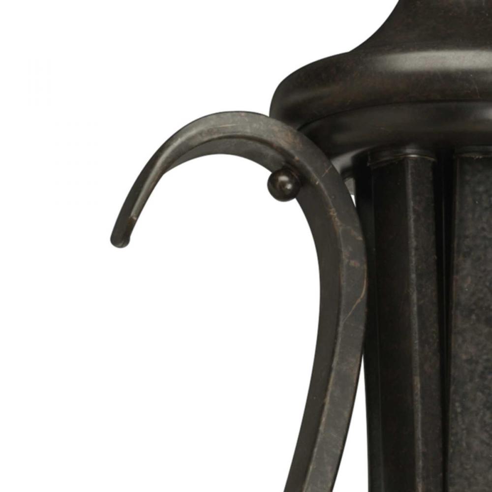 Forged Bronze finish.;Tea-stained glass bowl.;Distinctive ebbing and flowing of scrolls and arms.