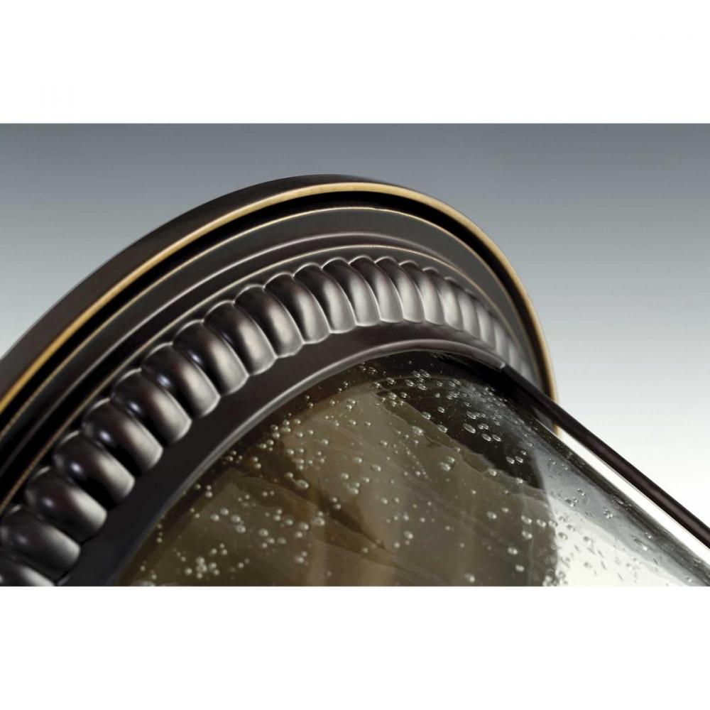 Add a touch of rustic appeal and classic styling with beaded detailing in the Westport collection. Clear seeded glass compliments the durable powder coat finish in die-cast aluminum frames. One-light close-to-ceiling. Antique Bronze finish.