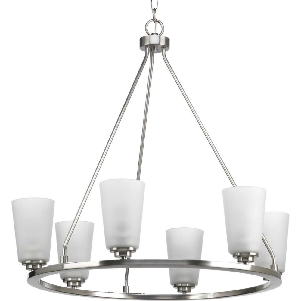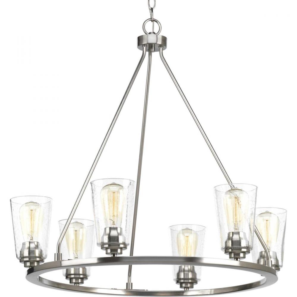 A new category of vintage modern fixtures takes center stage with this six-light chandelier from one of our Design Series collections. Delicate details in a Brushed Nickel finish, create statement making focal pieces for a variety of interiors. Debut provides a fitting stage to feature nostalgic, vintage lamps. Glass accessory shades available in clear or frosted seeded finishes.
