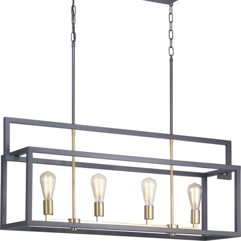 The Blakely collection four-light linear chandelier is a fashion-forward design style. A rectangular frame celebrates geometric interplay with clean, straight lines. Finished in Graphite with satin brass accents, the Blakely collection is ideal for Modern and Traditional interiors.