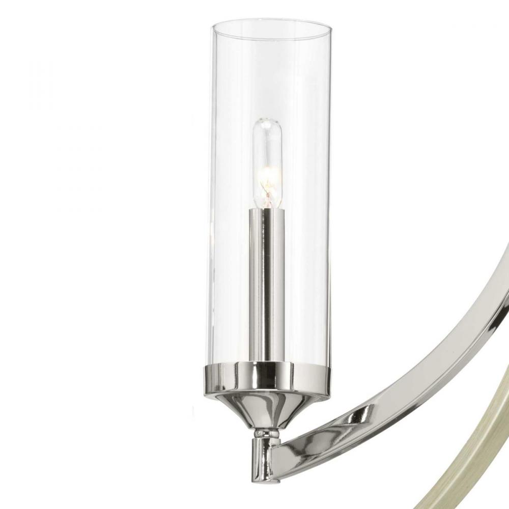 Mixed metal finishes highlight popular dual toned home decor accents;Updated design features an oversized oval form with candelabra lights;Polished Nickel with silver ridge accents;Uses five 60-watt max. candelabra style bulbs including LED equivalent (sol
