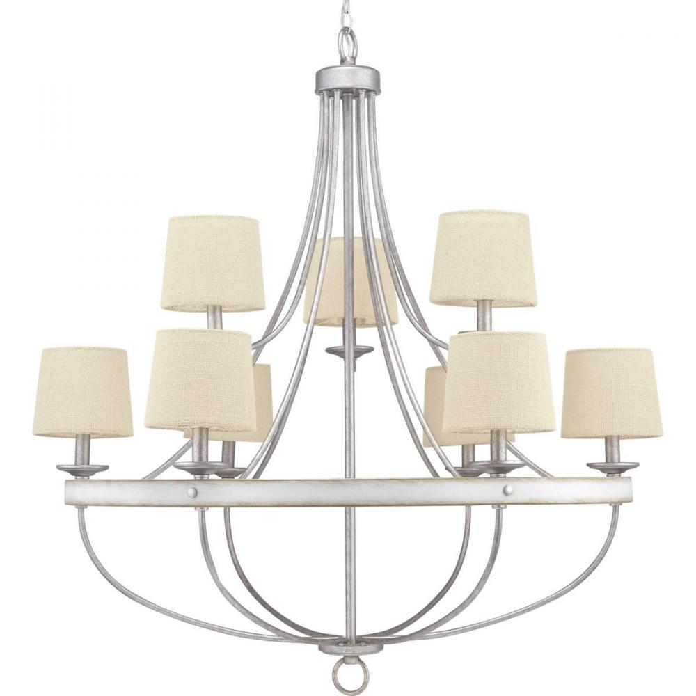 Gulliver’s deftly painted two-toned metal frame reads like a rustic wood finish;Change the look instantly with accessory shades in Natural Burlap (P860041) or Flax Linen (P860042) options;The distinguished five-light chandelier is ideal for foyers, entry