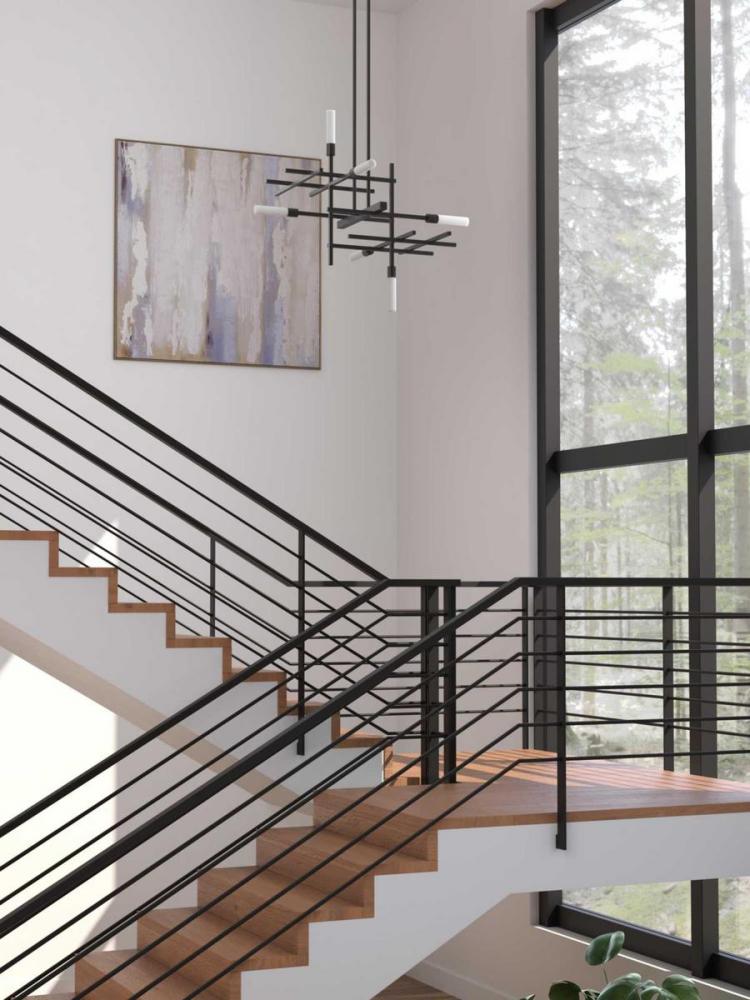 Define space with a minimalist approach with the Quadrant LED Collection 6-Light Matte Black Frosted Acrylic Modern Chandelier Light. Metal struts coated in a classic matte black finish are arranged in a modern geometric design giving the layered frame an impression of substance in space. Integrated LED lights tip the end of the metal struts and glow from within the crisp frosted shades that create airy illumination.