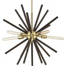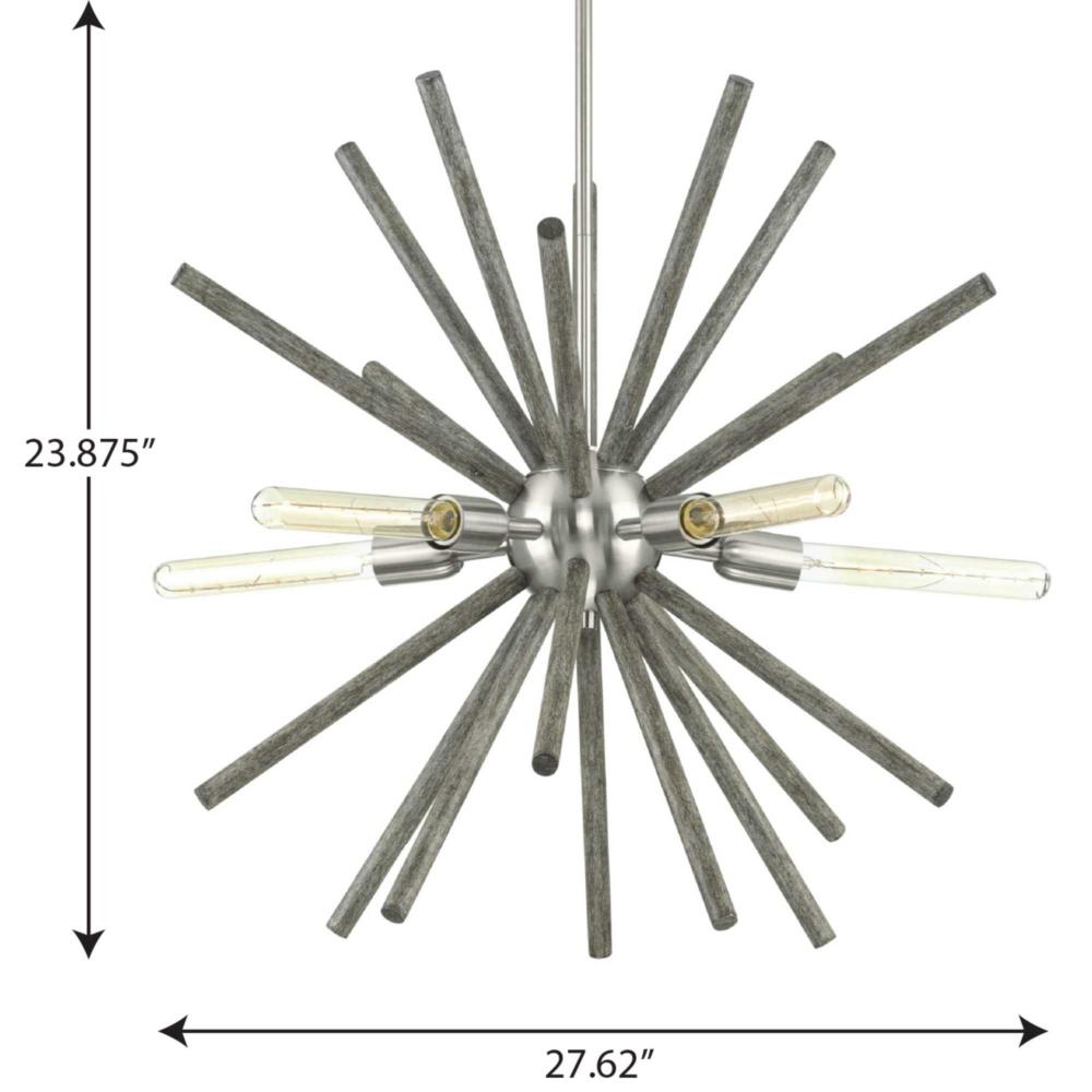 Fall in love with the starburst form reinvented by a rustic twist with the Thorpe Collection 5-Light Brushed Nickel Mid-Century Modern Chandelier Light. Angular lines coated in a faux Barnwood finish are accented by a beautiful brushed nickel center and smooth stem. Light sources extend from the center in a circular fashion for a softer, playful ambiance.