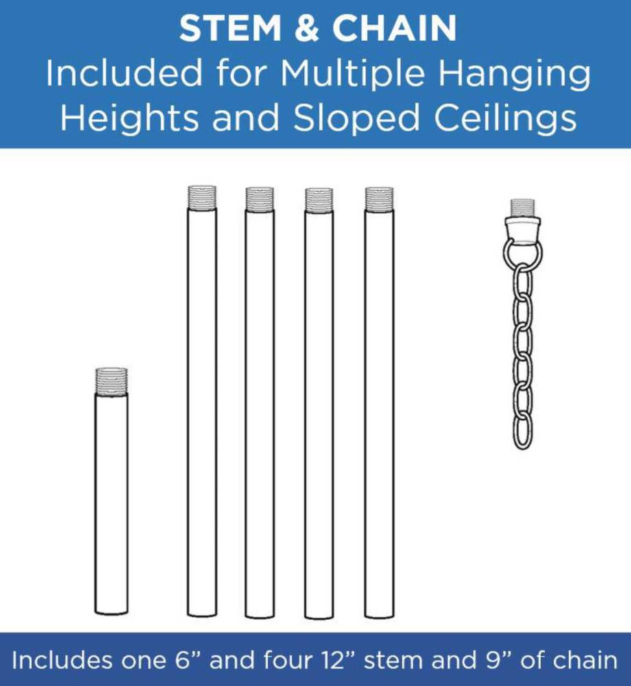 Includes one 6", four 12" stems and 6 links of chain for a variety of mounting types and sloped ceiling