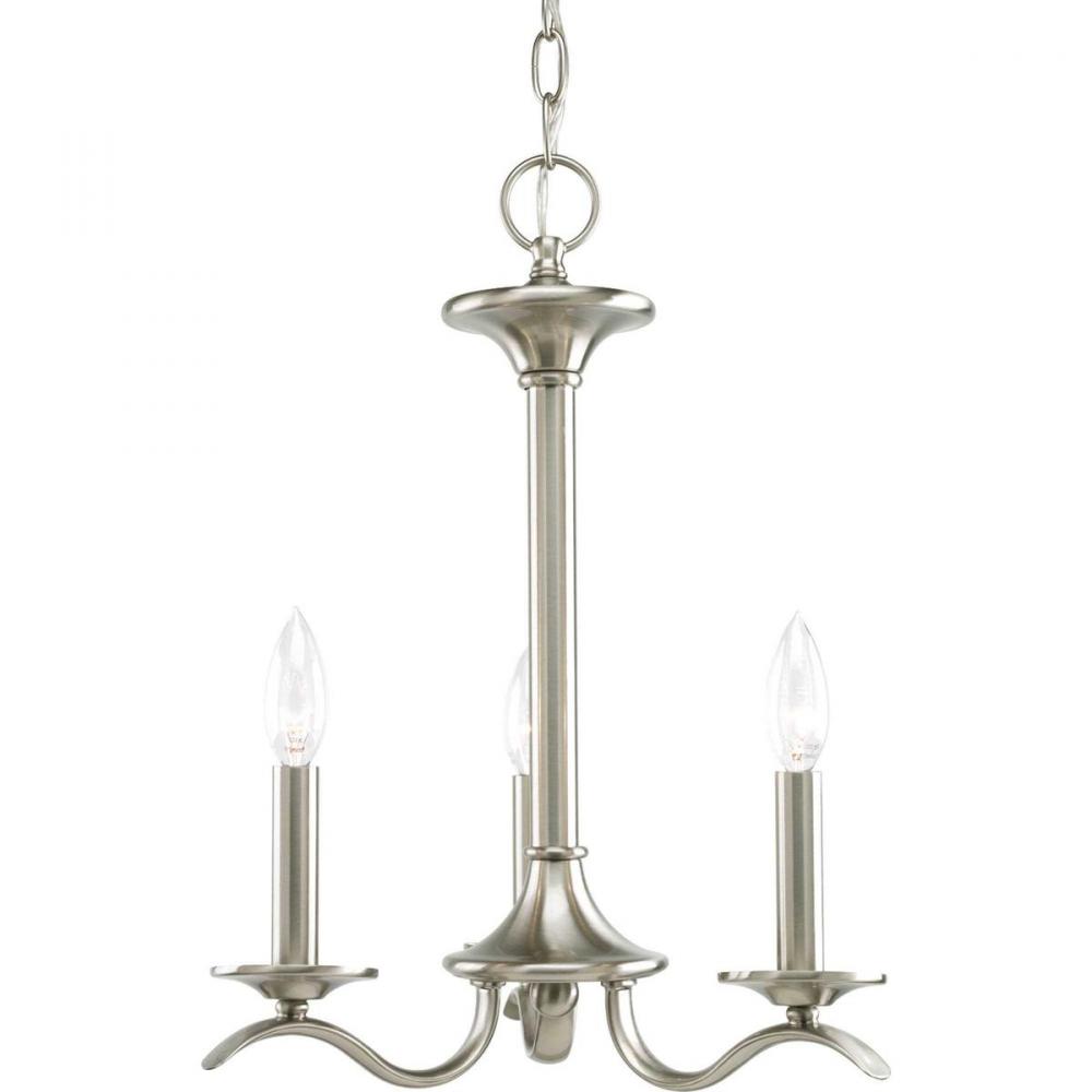 Harkening back to a simpler time, the Inspire Collection freshens traditional forms with flowing lines. Waving metal arms rush from the center to gracefully support off-white linen shades in this three-light chandelier in Brushed Nickel.