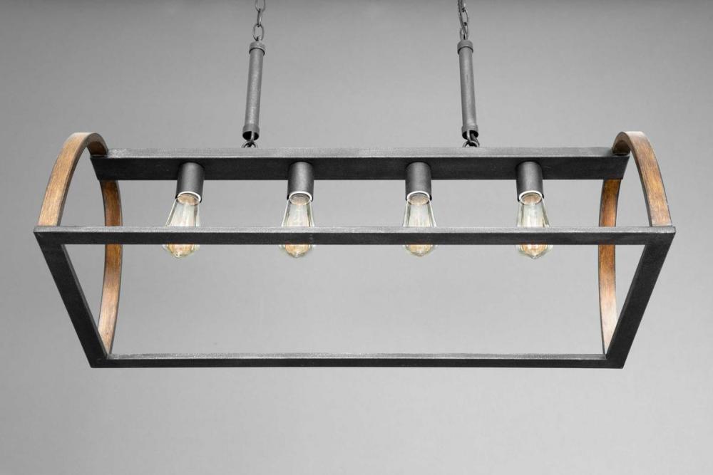 Fixtures within the Trestle collection offer a handsome look for industrial or rustic living spaces. Featuring a hand painted cage with geometric elements, pendant and linear options can revive a look over kitchen island or bar, as well as dining and living spaces. The Gilded Iron finish is enhanced by hand-painted oak accent. Four-light island light.