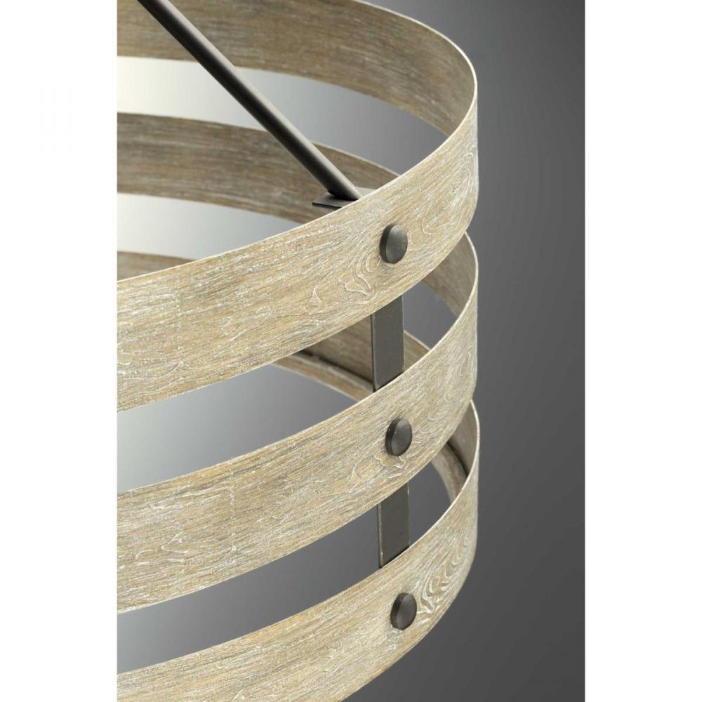 Graphite finish.;Three circular bands wrap together to form open design.;Hand painted to emulated weathered driftwood.;Accented by smooth knobs and exposed bulbs.;Ideal for rustic farmhouse decor.