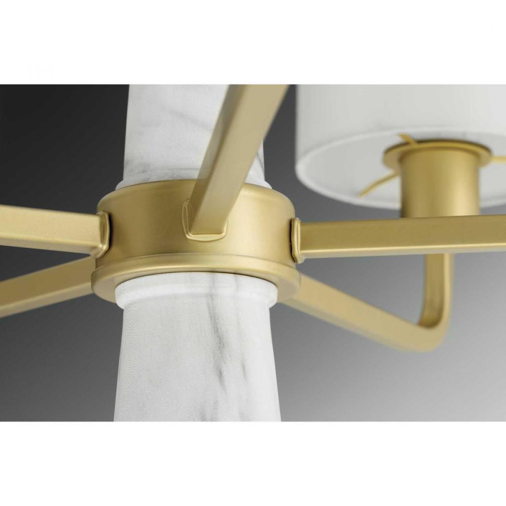 An intriguing fashion-forward lighting collection, Palacio pairs a Vintage Gold cage with faux white marble accents on the candles for a stunningly elegant design. The four-light Pendant is ideal for a variety of interiors.