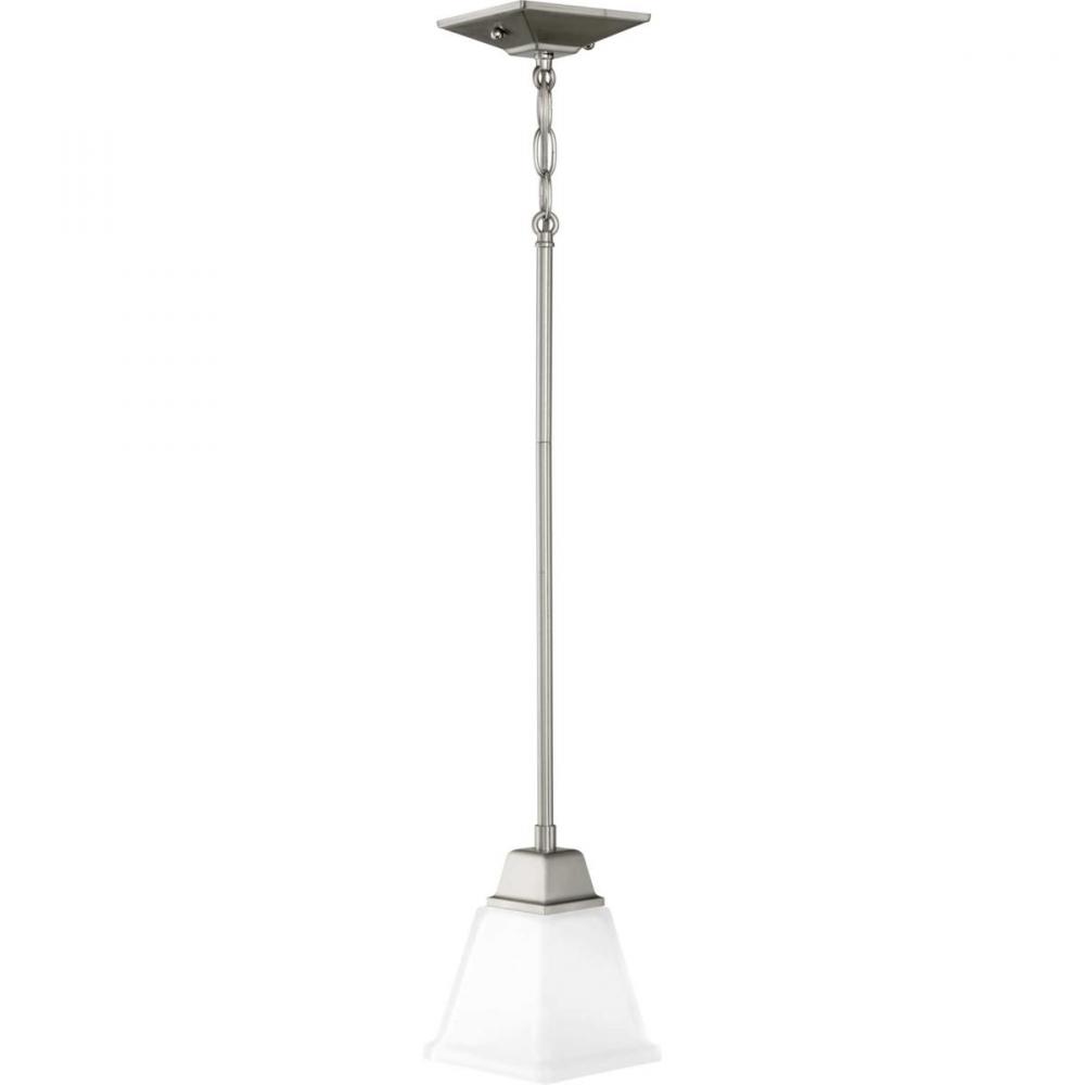 Distinctive forms and clean lines are key features within the Clifton Heights collection;Inspired by Craftsman styling, special attention to decorative details can be appreciated in each fixture;Elegant etched glass;Brushed Nickel finish;1-light mini-penda