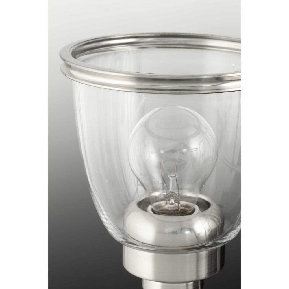 Clean comfortable forms with gentle curves are highlighted in Saluda;Softly shaped clear glass shades are accented with a banded ring and nestled on a socket cup to complete the form.;Clear glass shade;Brushed Nickel finish;1-light mini-pendant;Uses 1, 60-
