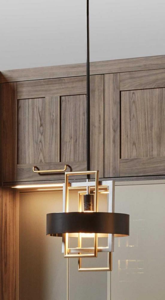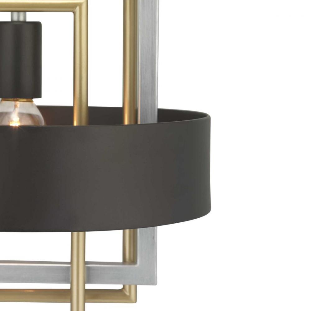 An array of geometric patterns in Adagio one-light pendant is a nod to the musical description of a tender and melodic tone. The modern design features lights that are distributed around a circular Black band. Mixed metal elements, which are present in Brushed Silver and Brushed Brass accents, can complement monochromatic color palettes that are popular in homes today. Each fixture in the Adagio collection creates a focal point and is ideal for Luxe and Modern interiors.