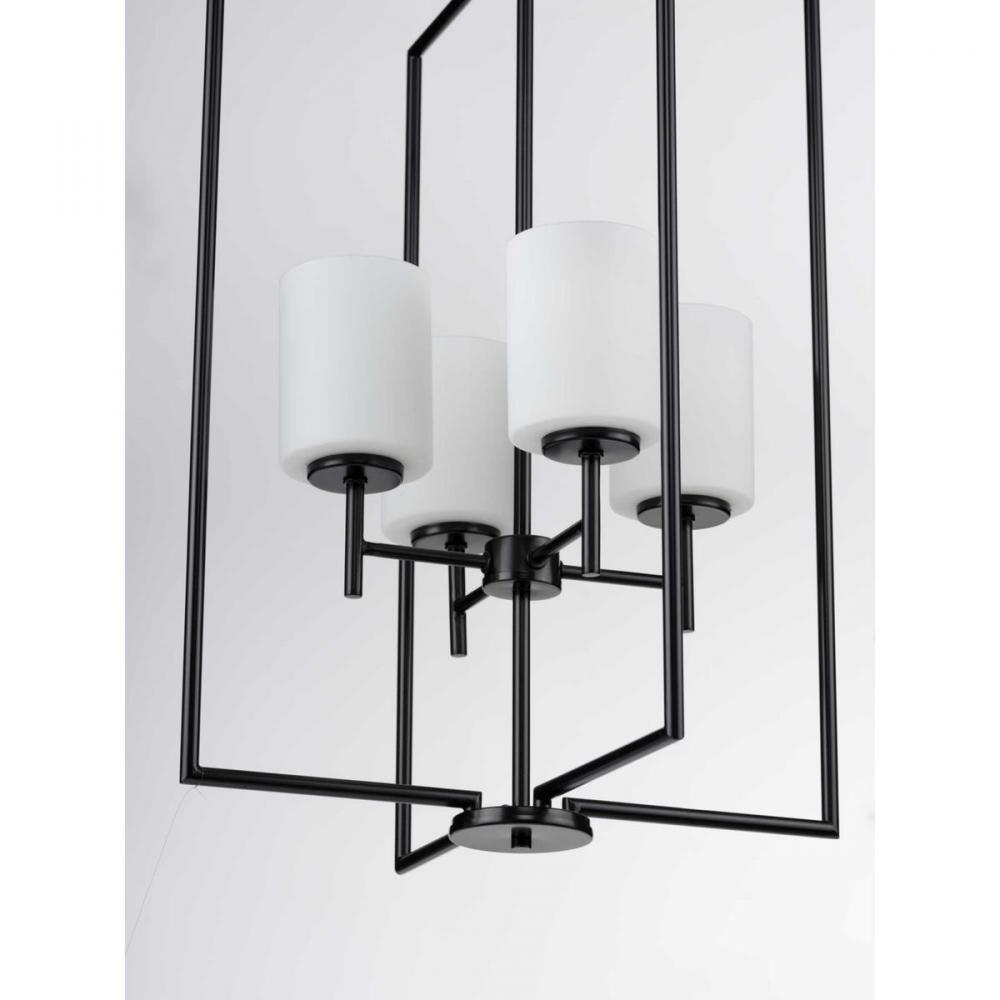 Welcome guests with elegance and class as the Reply four-light pendant washes its soft glow over a foyer, dining table, or large kitchen island. The timeless, rectangular silhouette with a statement-making Black finish extends above and below the white, etched glass shades assembled at the fixture’s center, making it an excellent piece for transitional and modern settings.