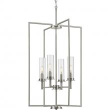 Balance the best of modern and traditional with the Kellwyn Collection 4-Light Matte Black Clear Glass Transitional Foyer Pendant Light. The classic cage design is composed of crisp, clean lines coated in a beautiful matte black finish for a touch of luxury. Light sources glow within clear, cylindrical glass shades for luxurious illumination.