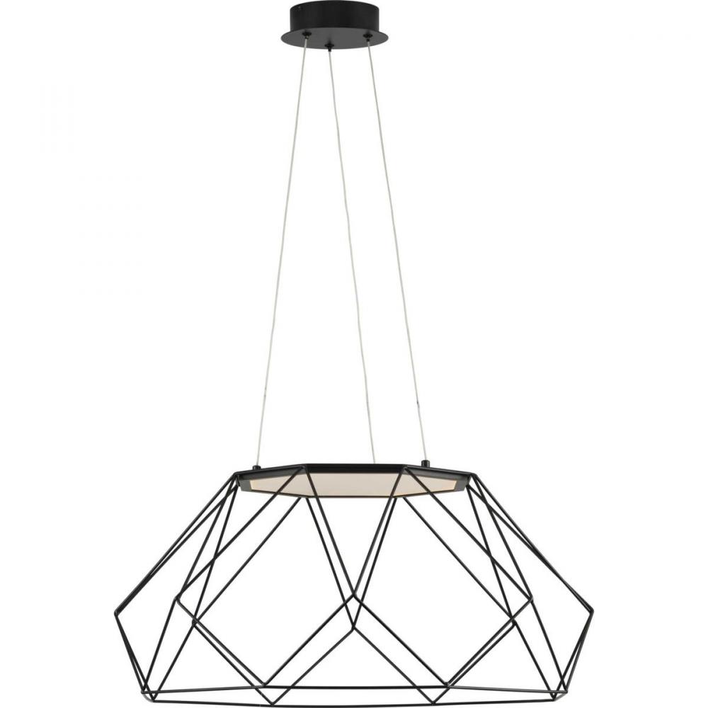 Take a contemporary space to a new level with the Geodesic LED Collection Matte Black LED Mid-Century Modern Large Pendant Hanging Light. The open diamond-patterned frame is coated in a classic matte black finish and is suspended from cables attached to a round ceiling plate. A uniform, continuous disc of light glows through the airy frame.