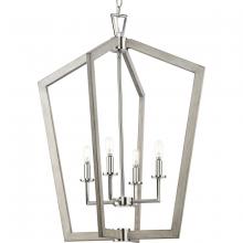 Clean, modern lines combine with rustic elements in the Galloway Collection. A lightly distressed white finish highlights an open, angular frame suspended from a triangular loop detail attached to an adjustable chain and simple round canopy, all finished in crisp matte black. Matte black columns hold candelabra lights that glow brightly within the stately form to illuminate spaces in a casually elegant style. The larger scale and airy design of this foyer light makes it the perfect accompaniment for great rooms, bedrooms and dining rooms.