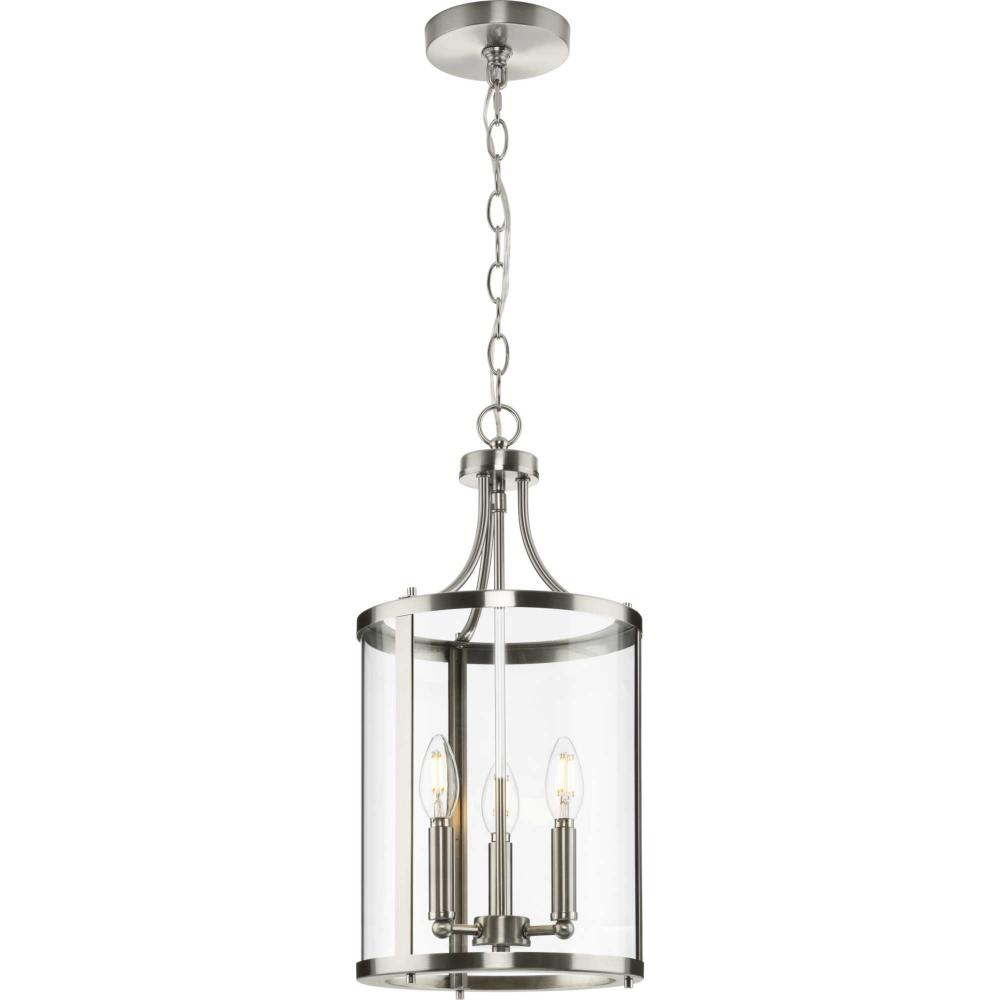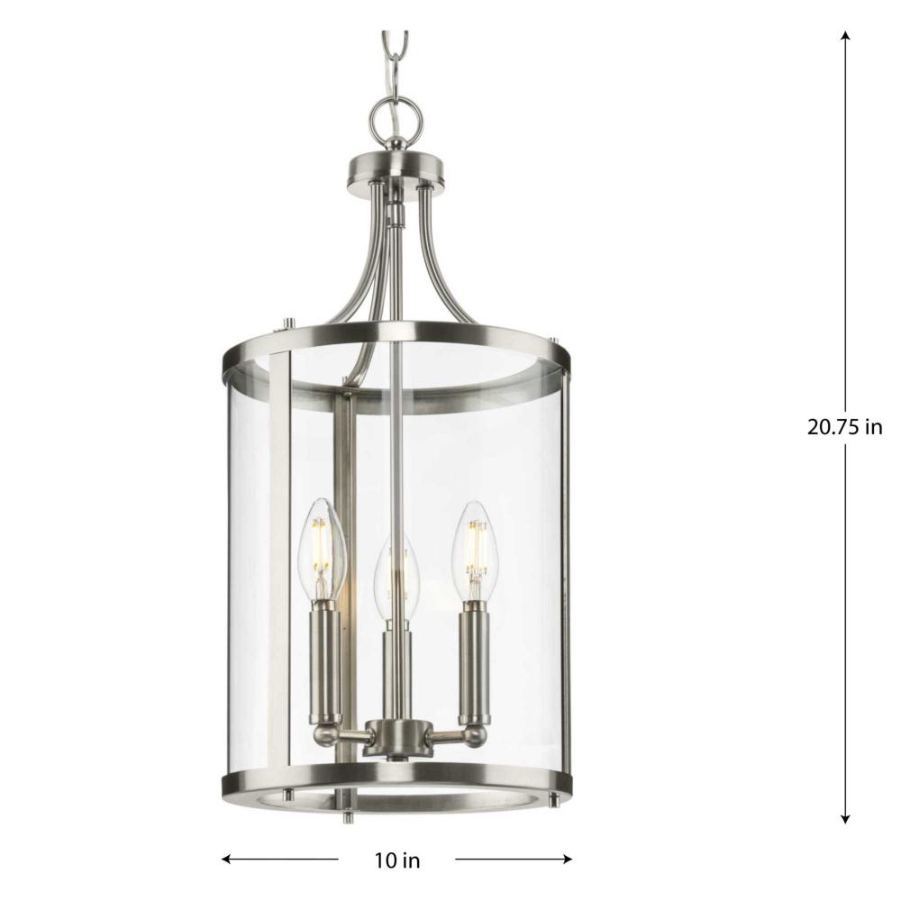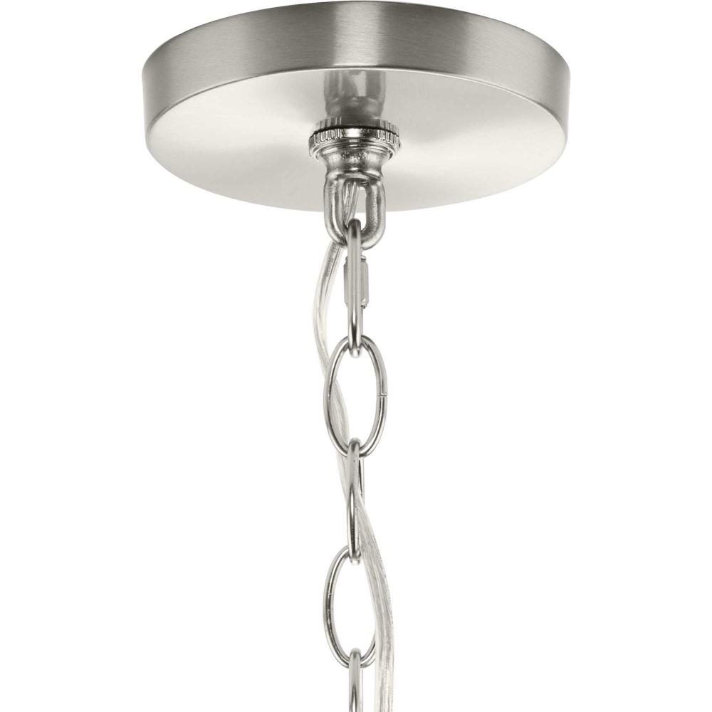 The fixture is coated with a subtle brushed nickel finish, adding a beautiful statement to halls and foyers