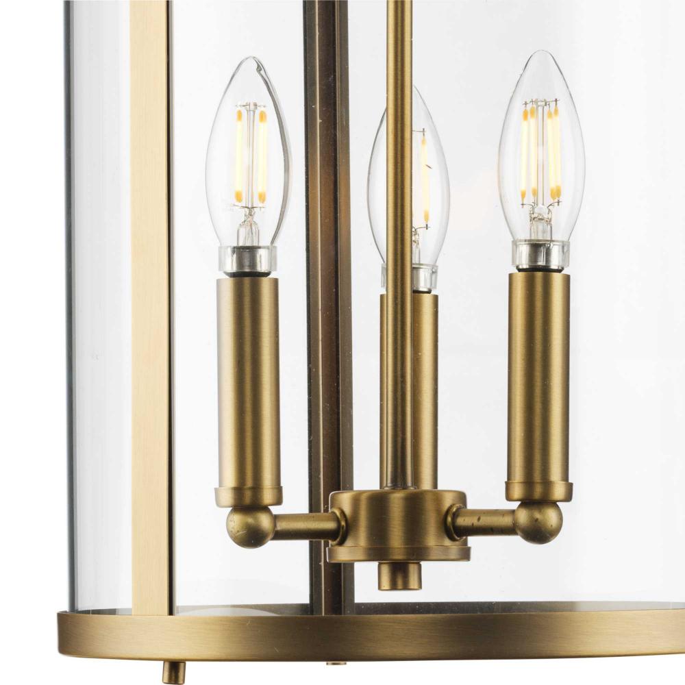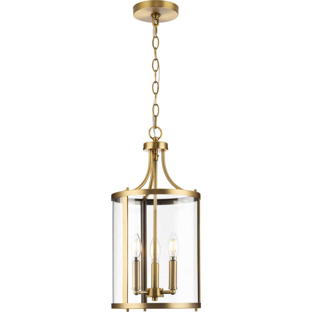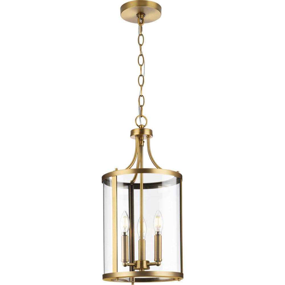 The fixture is coated with a gold-toned, vintage brass finish, adding a beautiful statement to halls and foyers
