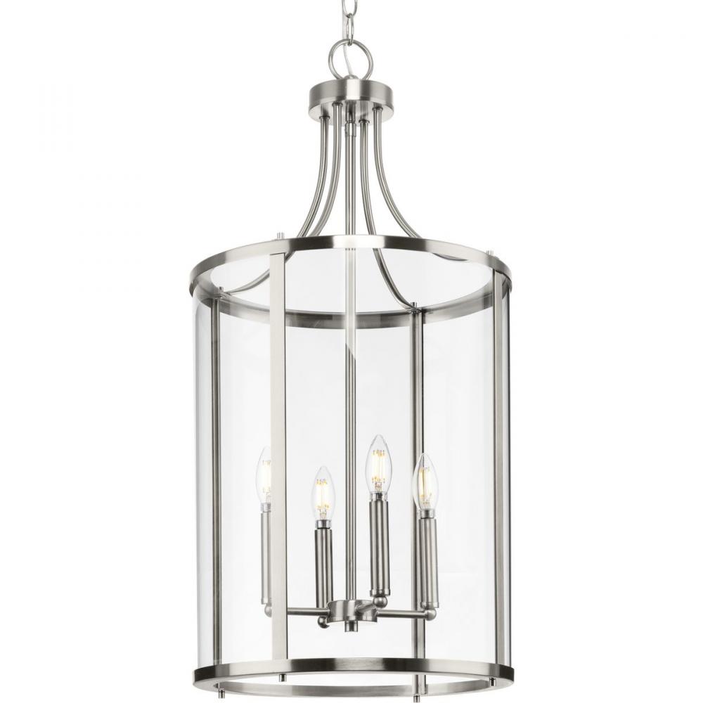 The fixture is coated with a subtle brushed nickel finish, adding a beautiful statement to halls and foyers