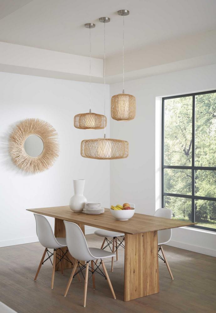 Handcrafted rattan shade is ideal to complement modern organic and globally influenced décor.