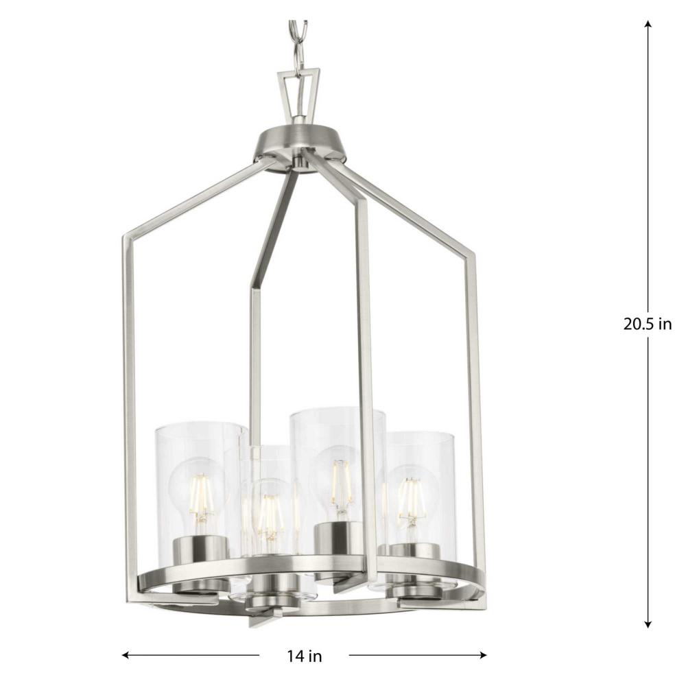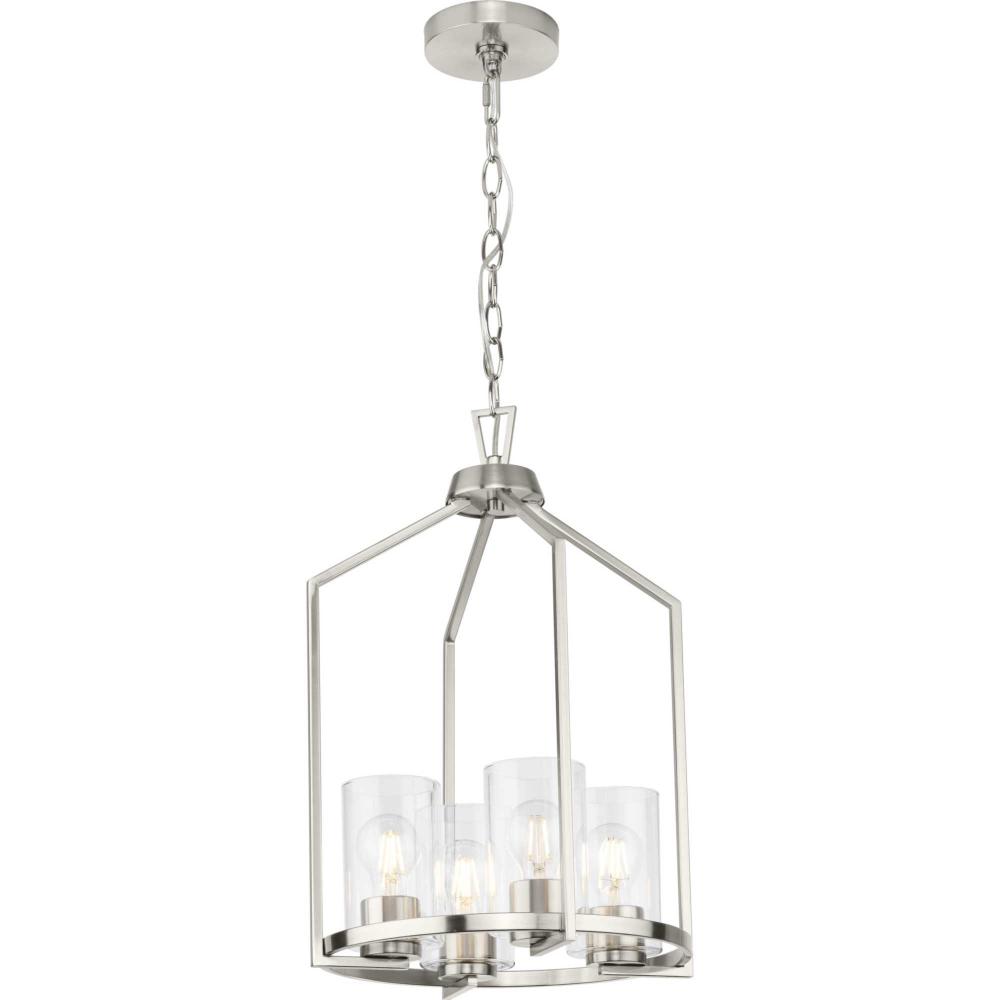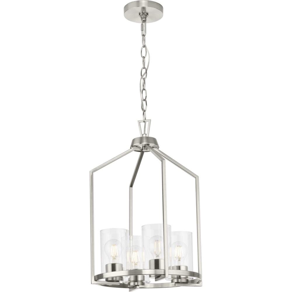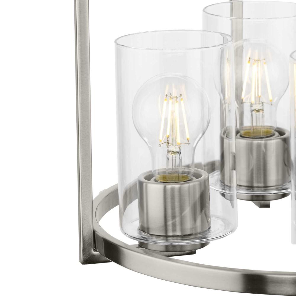 Clear glass shades deliver a modern flair to the fixture's contemporary form