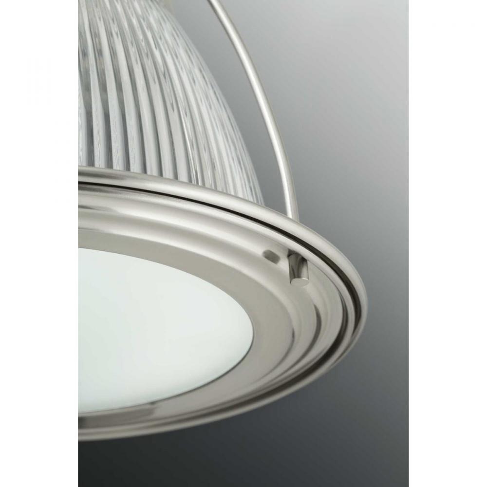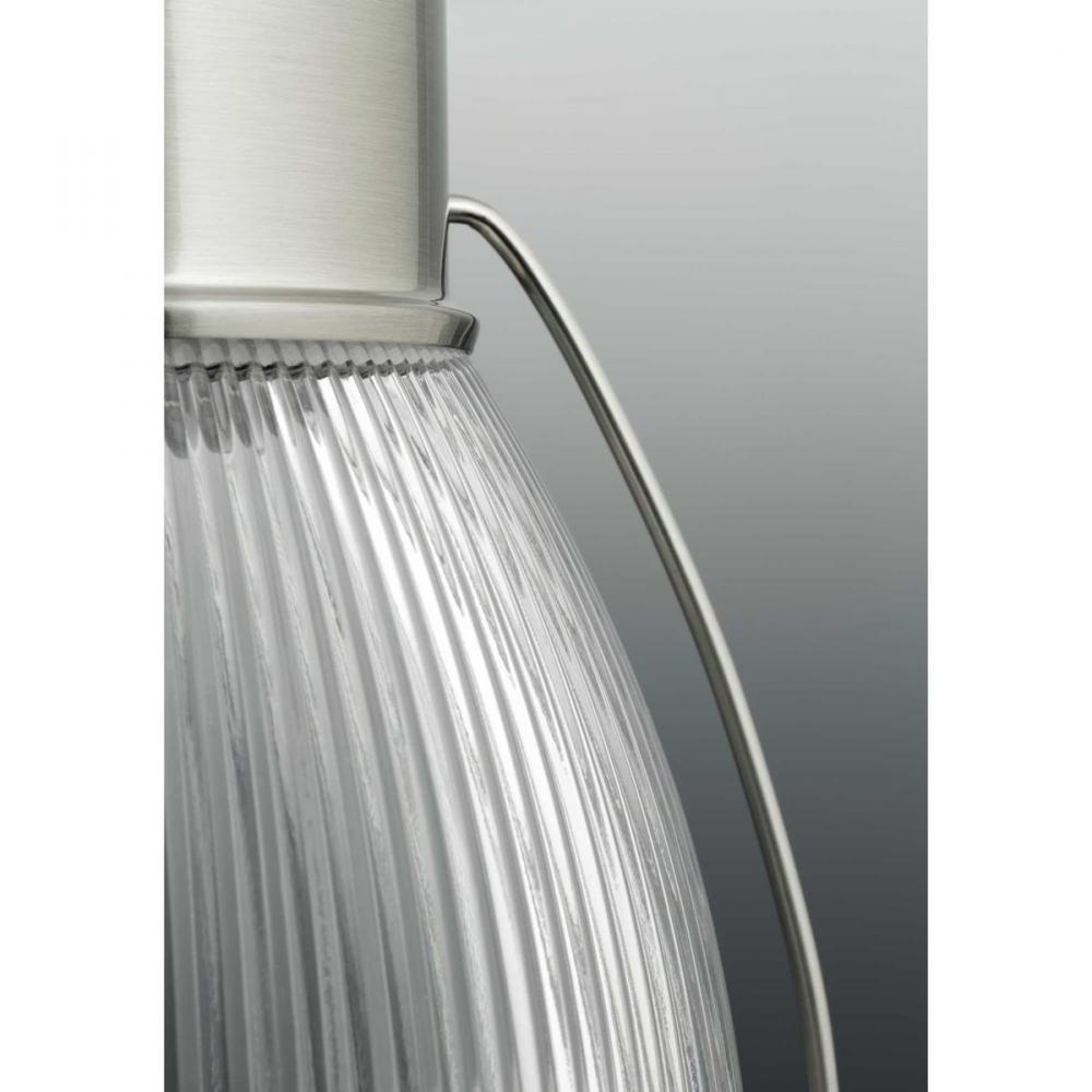 One-light pendant with a bold and striking Prismatic Glass shade as the focal point of the fixture. This pendant also features a sleek Brushed Nickel cap and stems, highlighting the industrial styling. The bottom of the fixture is enclosed with an etched glass diffuser.