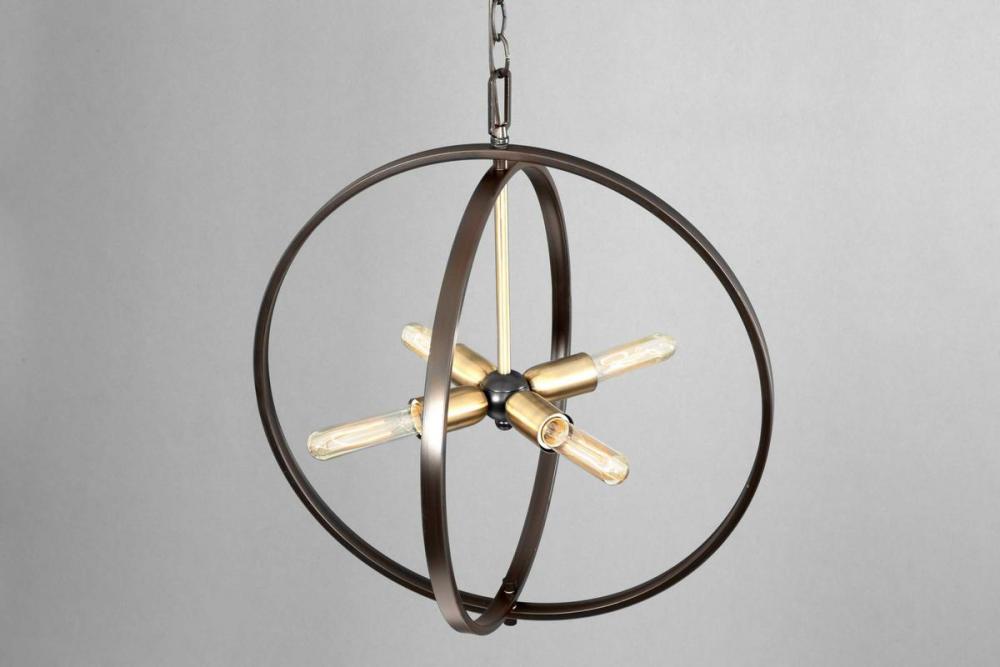 The four-light sphere medium pendant within the Swing Collection features mixed metal accents in an Antique Bronze finish with Vintage Brass candle holders. The vintage undertones adds style to dining rooms and kitchens.