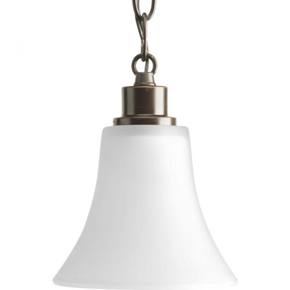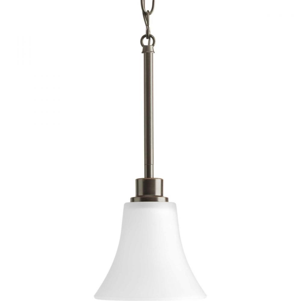 Gleeful simplicity defines this one-light mini-pendant from the Joy Collection. Refreshing and fashionable arcing forms of Antique Bronze metal arms enhance the etched white fluted glass. Coordinating fixtures from this collection let you decorate an entire home with confidence and style. Unique stem-hung construction carries the clean line all the way to the ceiling and, for sloped ceilings, six feet of 9 gauge chain is provided to allow the fixture to hang straight and level.