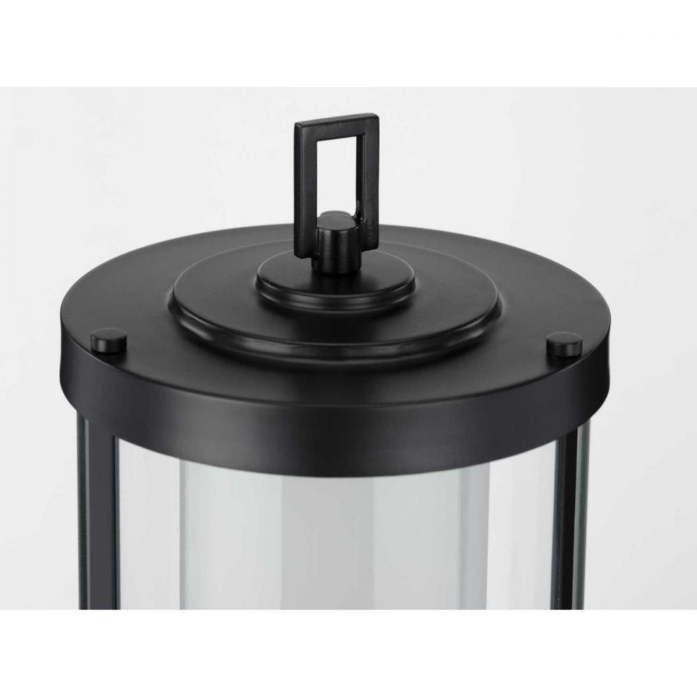 Matte black frame features a decorative rectangular design on its top.;A clear glass shade holds an etched glass diffuser ready to provide a lovely ambient glow.;Modern light fixture with an industrial flair.;Ideal for any outdoor space in need of illumina