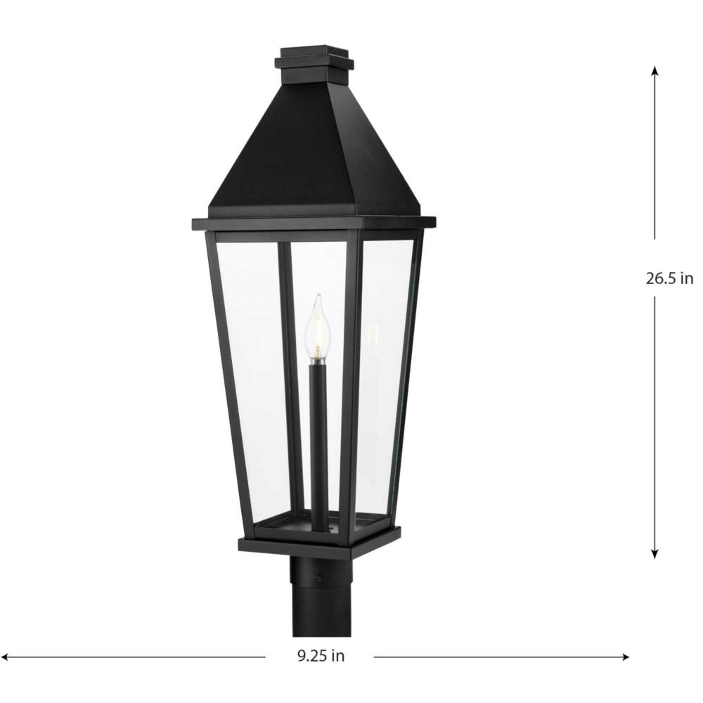 Inspired by vintage glass lanterns, the Richmond Hill Collection has a slender, tall profile and crisp angular details coated in a classic textured black finish. A stately candle enclosed within clear glass panes highlight's the elongated, tapered design while delivering crisp illumination. The updated traditional design of thispost light offers fresh style to the landscapes of modern farmhouse and transitional homes. Mount this light on a 3" standard post (sold separately). It is cULus wet location listed for use where water may be present, with a one-year warranty to guarantee your complete satisfaction. Progress Lighting products are designed for exceptional quality, reliability, and functionality.