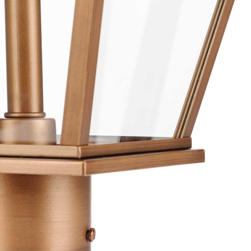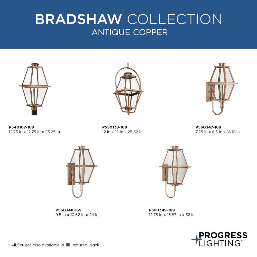 The Bradshaw Collection nods to historical style with its traditional lantern design, beautifully updating a homes curb appeal. A comforting glow is diffused through clear glass panes, creating a warm and romantic ambiance.The gracious lines of this post lantern, finished in mellow painted antique copper, elegantly complement landscapes of traditional, transitional and farmhouse settings. It is cULus wet location listed for use where water may be present, with a one-year warranty to guarantee your complete satisfaction. Post mounted, fits standard 3 post (sold separately). Progress Lighting products are designed for exceptional quality, reliability, and functionality.