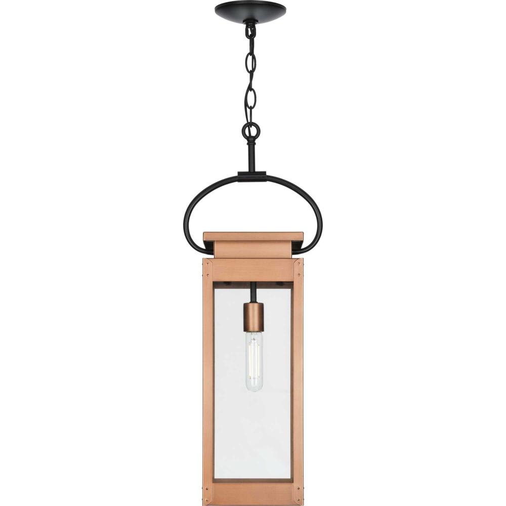 The light is coated in an antique copper finish, highlighting the flat clear glass panels and a black strap detail