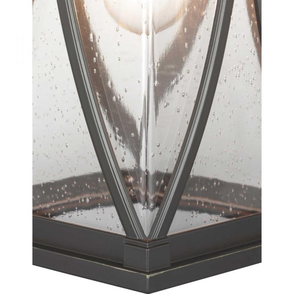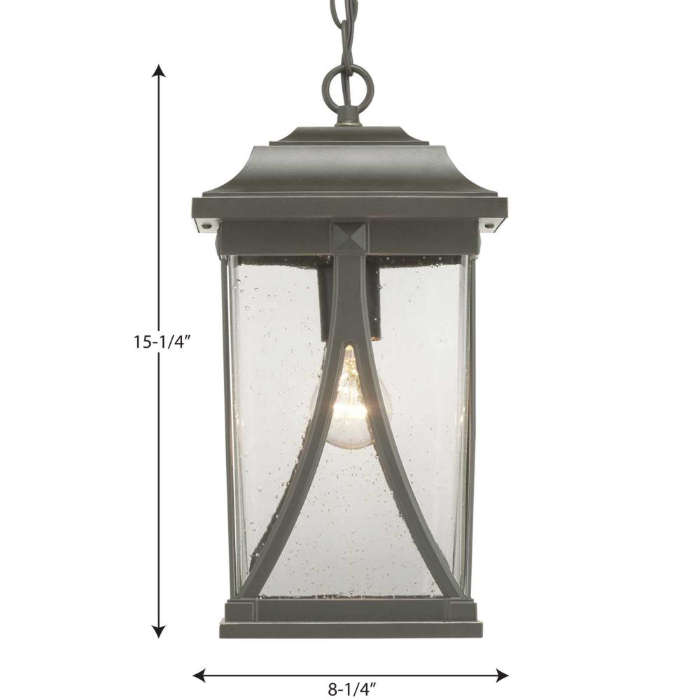 Distinctive forms with ancient roots are featured in this hanging lantern from the Abbott Collection. Transparency, depth and dimension are all on display to highlight the clear seeded glass and sweeping details within the Antique Bronze frame.