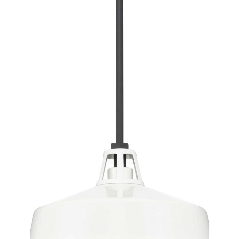 Ideal for a patio, kitchen, or porch;Perfect for farmhouse, urban industrial, and coastal style settings;Crisp white finish with textured black accents;White metal shade;Includes one 6-inch stem and four 12-inch stems to adjust for a variety of ceiling hei