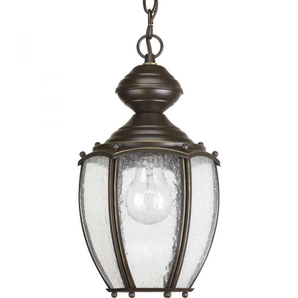 Solid one-light 7" hanging lantern in rich weathered finish is complemented by seeded glass panels - a great choice for low maintenance and years of enjoyment. Chain and ceiling mounts included. Antique Bronze finish.