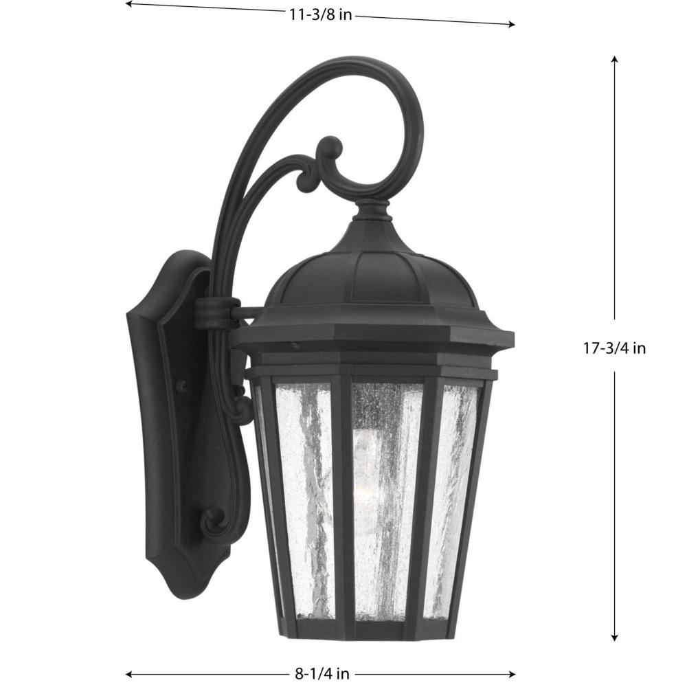 The one-light medium wall lantern in the Verdae collection offers traditional styling for a variety of exteriors. Classic and formal clear seeded glass complements a Black finish. Open bottom design allows easy access to replace lamps. Black finish.