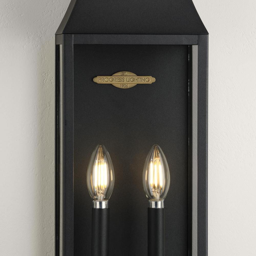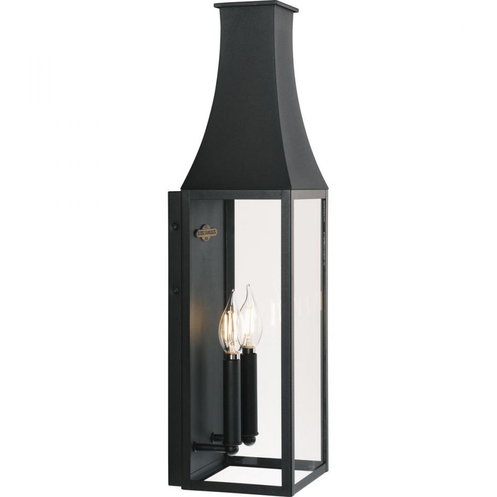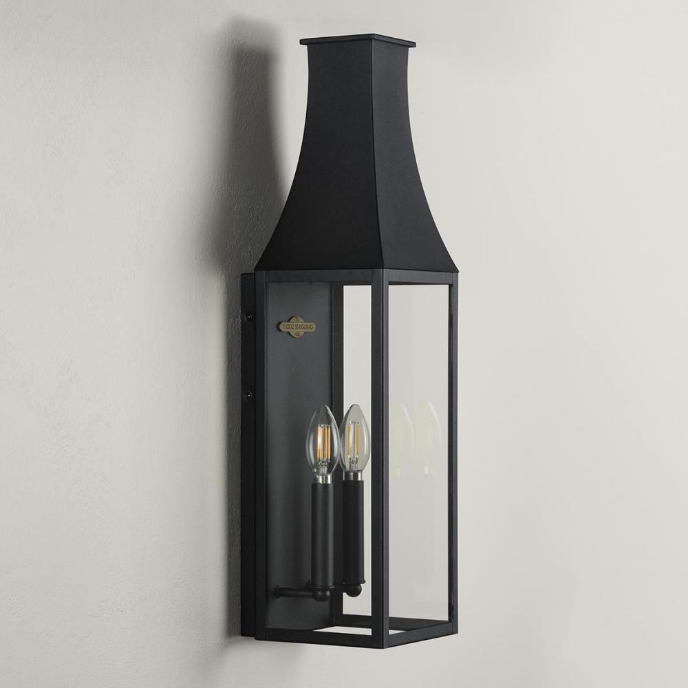 The Radcliffe Outdoor Wall Lantern offers a touch of old-world charm with its traditional mansard roof design. Inside, two candelabra lamps cast a warm glow softened by the clear glass panes that encase the black frame. A small plaque within the frame prou