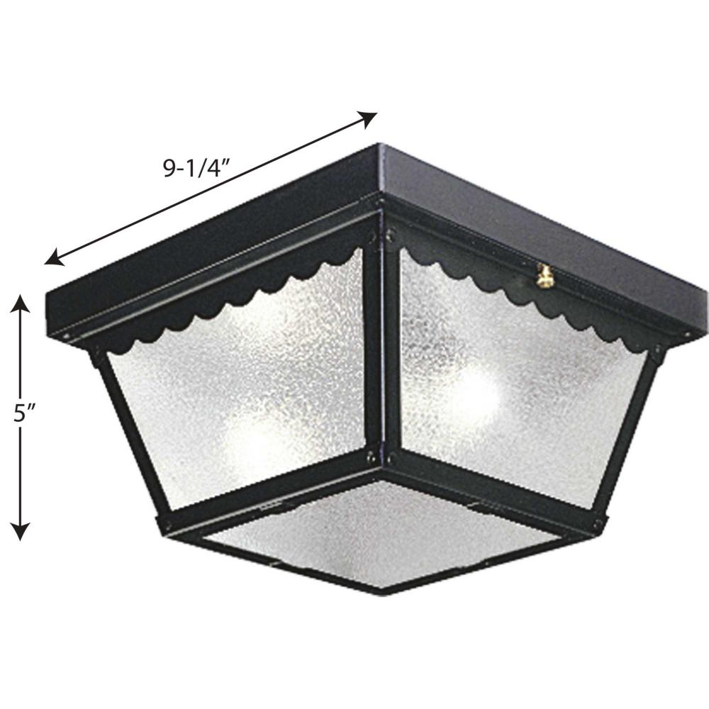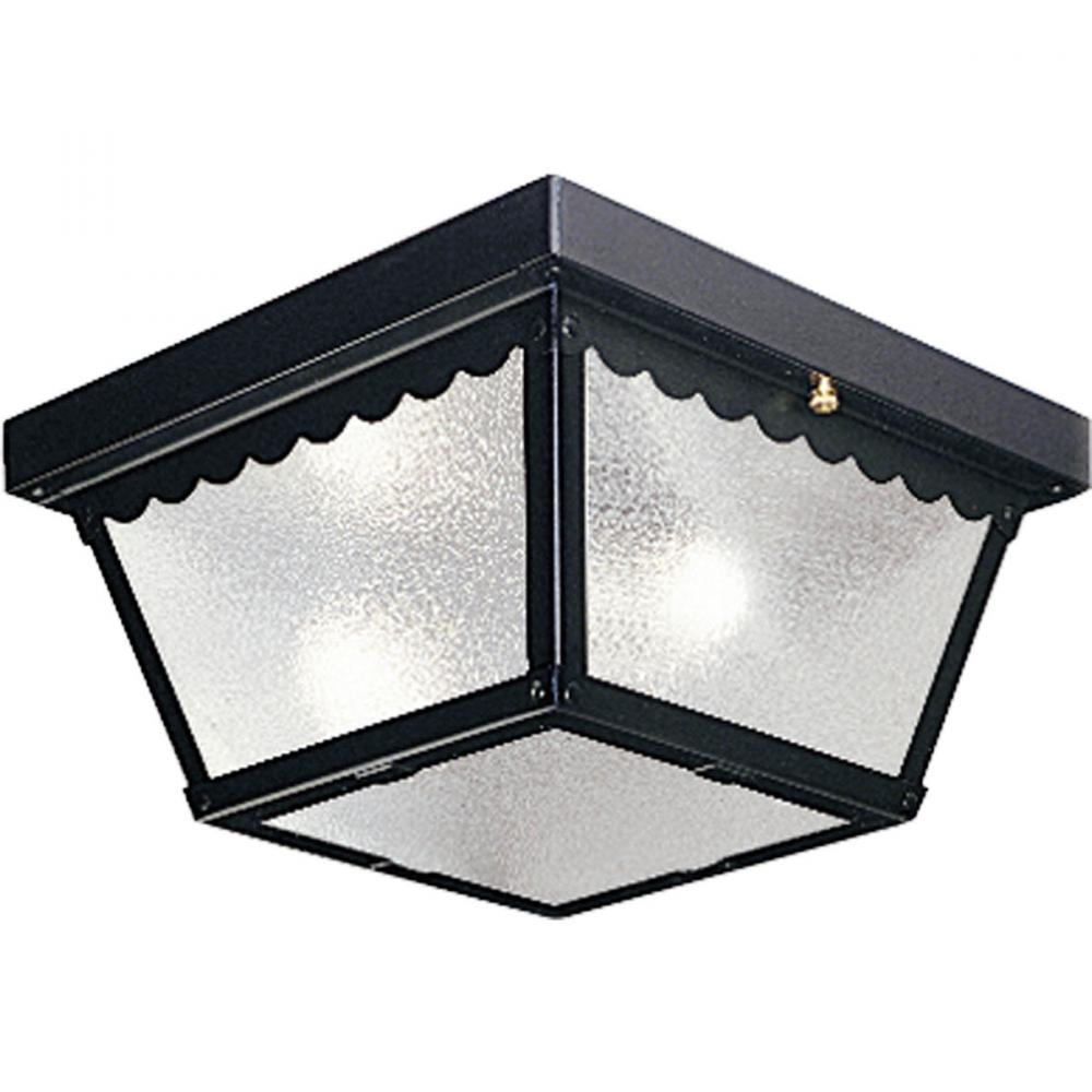 Two-light ceiling mount fixture with textured glass and scalloped edge detailing. Powder coat finish. Black finish.
