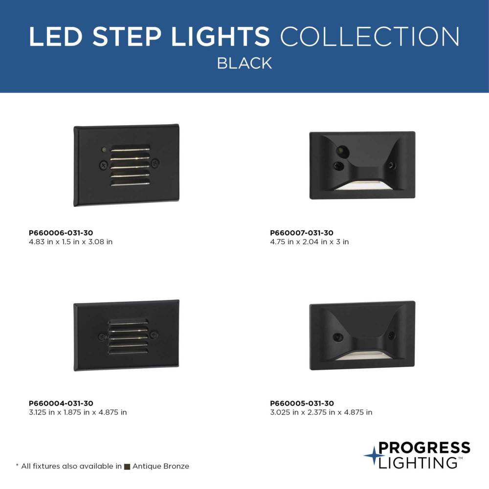 The LED Step/Wall Light finished in black will complement many interior and exterior architectural styles, whether residential or commercial. A horizontal and a vertical exterior face plate are provided to accommodate either a horizontally or vertically oriented installation. The step light features an integrated 120V AC light engine, eliminating the need for an additional LED driver. The light engine is enclosed in a gasketed lens, allowing it to meet the rigorous demands of wet location use. Its dimmable LED light source offers optimized, energy-efficient light output, 3000K, 90CRI. The die casted face plates offer modern styling with added performance, directing the light downwards with full cut-off of higher angle light to minimize glare. Use these lights to clearly illuminate stairs, walls, and walkways, resulting in performance, cost and safety benefits. It is cCSAus wet location rated for use in areas with direct water contact.