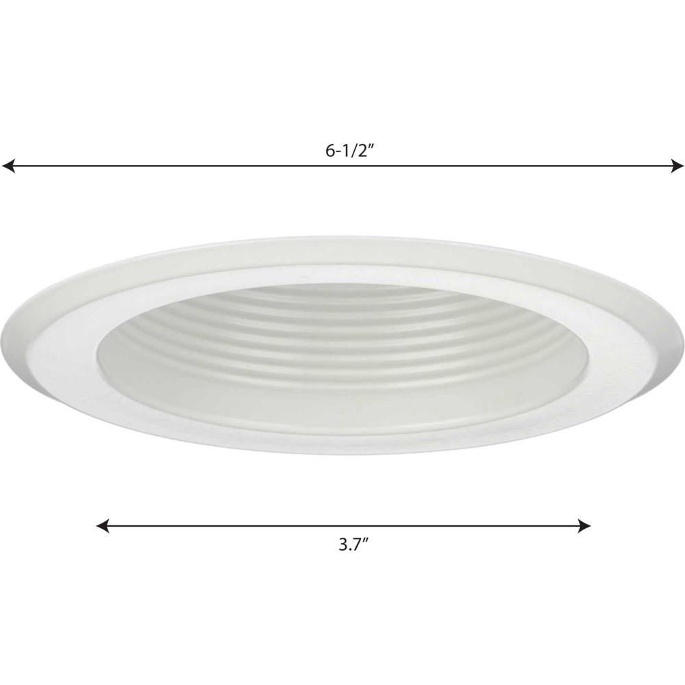 5" Shallow Step Baffle Trim in a Satin White finish. One-piece construction with integral matching satin white powder painted metal flange. The trim uses friction springs to attach to the housing to provide a flush fit against the ceiling. Compatible for use in Progress P851-ICAT and P1841-ICAT.
